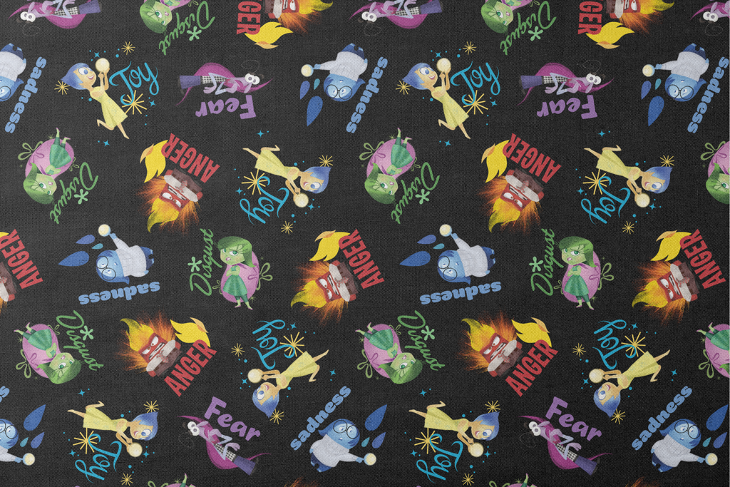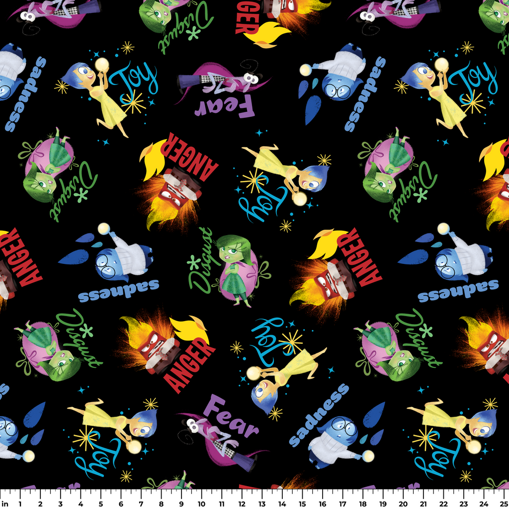 This vibrant cotton fabric features iconic characters from Disney and Pixar's Inside Out scattered on a black background, perfect for crafting custom face masks, quilting projects, or children's apparel.