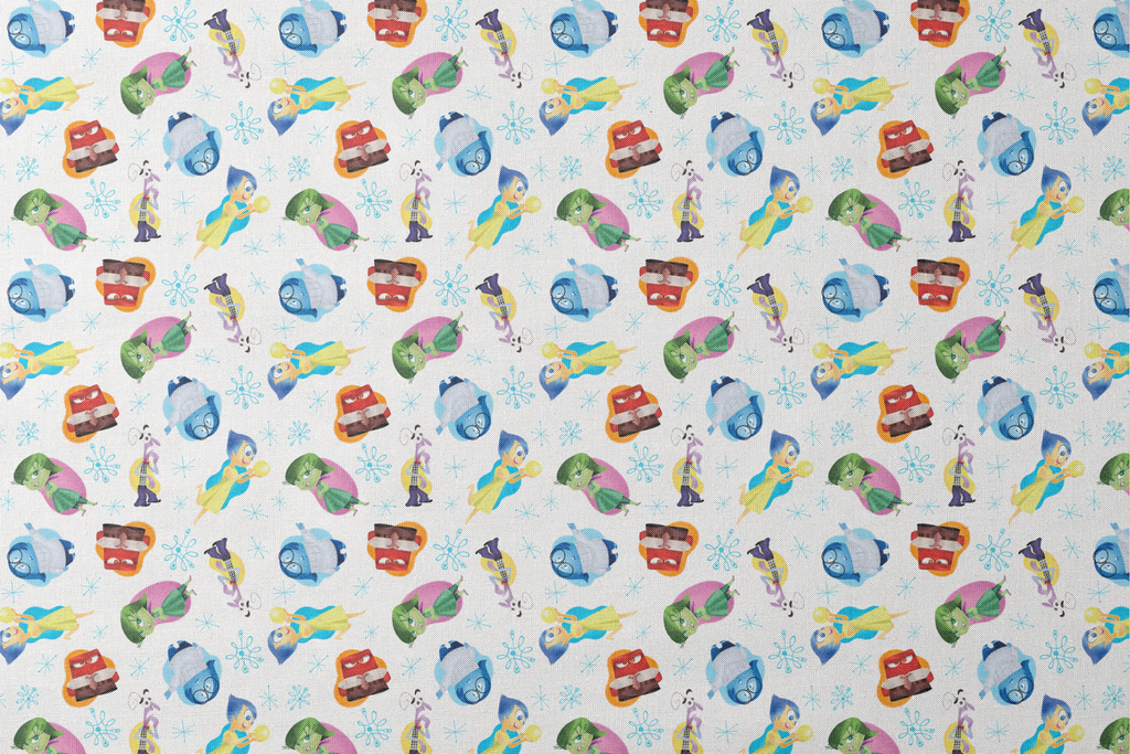 Colorful Disney and Pixar's Inside Out character pattern with Joy, Sadness, Anger, and other emotions on a snowflake-decorated white background - perfect for kids' decor or apparel.