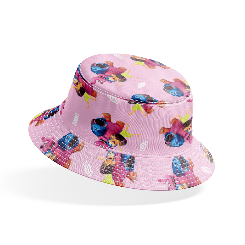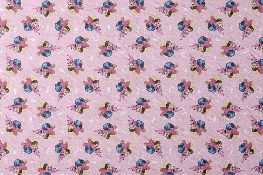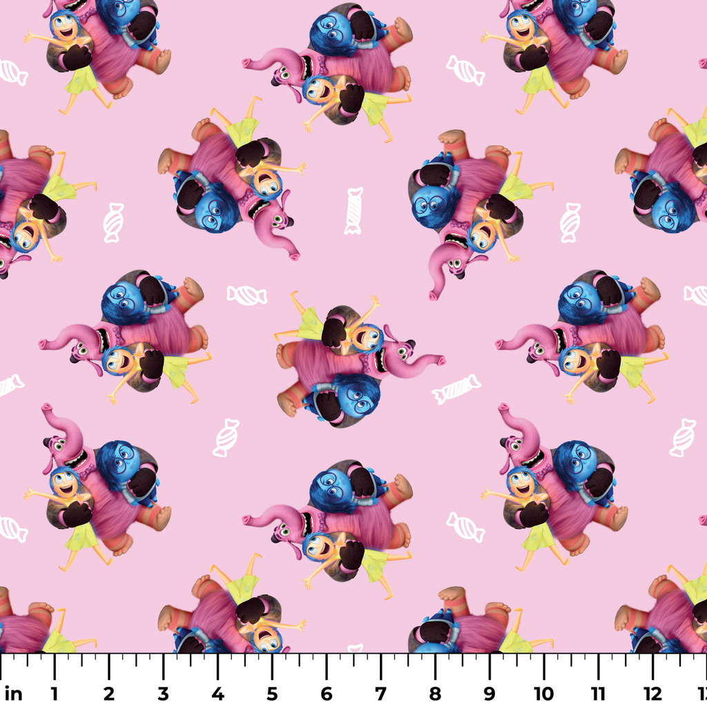 This whimsical print features characters from Disney and Pixar's Inside Out, showcasing playful poses on a soft pink background with scattered candy motifs for a fun, contemporary children's fabric design.