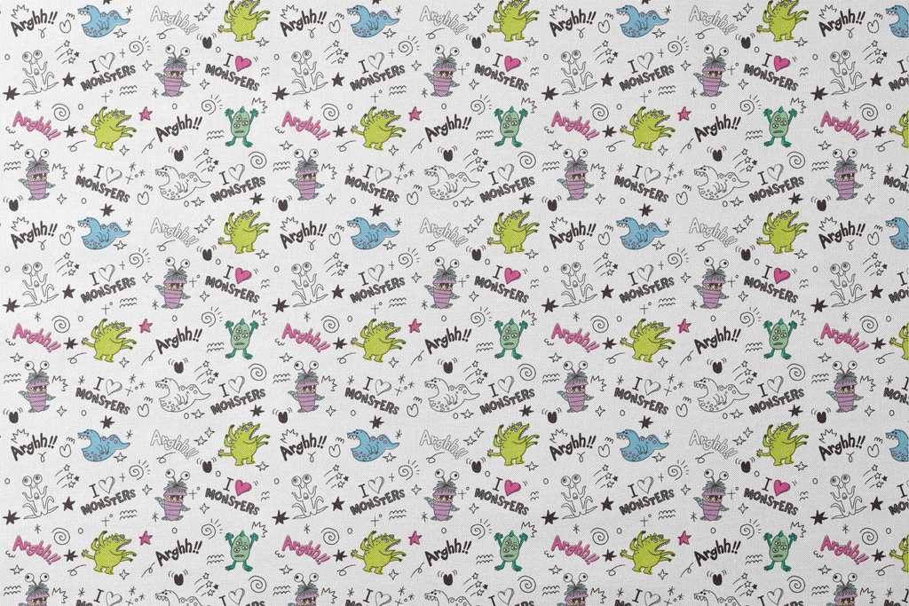 Whimsical monster doodles in playful cartoon style featuring colorful creatures with "I ♥ MONSTERS" text. Perfect for kids' apparel, accessories, or room decor with its fun, quirky aesthetic.