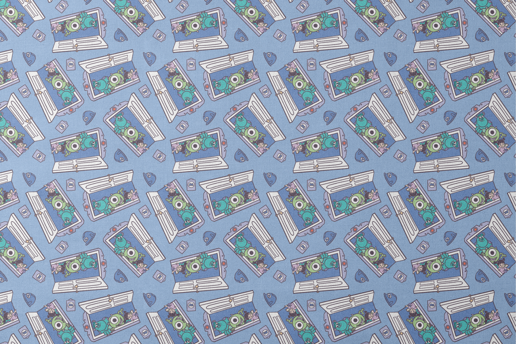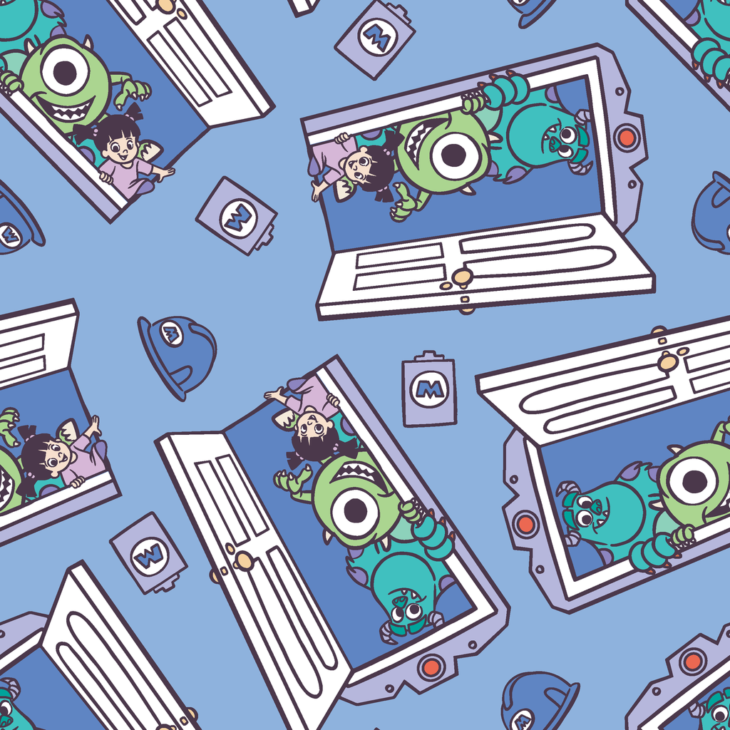 Adorable Disney and Pixar's Monsters, Inc. inspired pattern featuring cute cartoon characters peeking out of open laptops on a blue background - perfect for any tech-loving Disney fan.