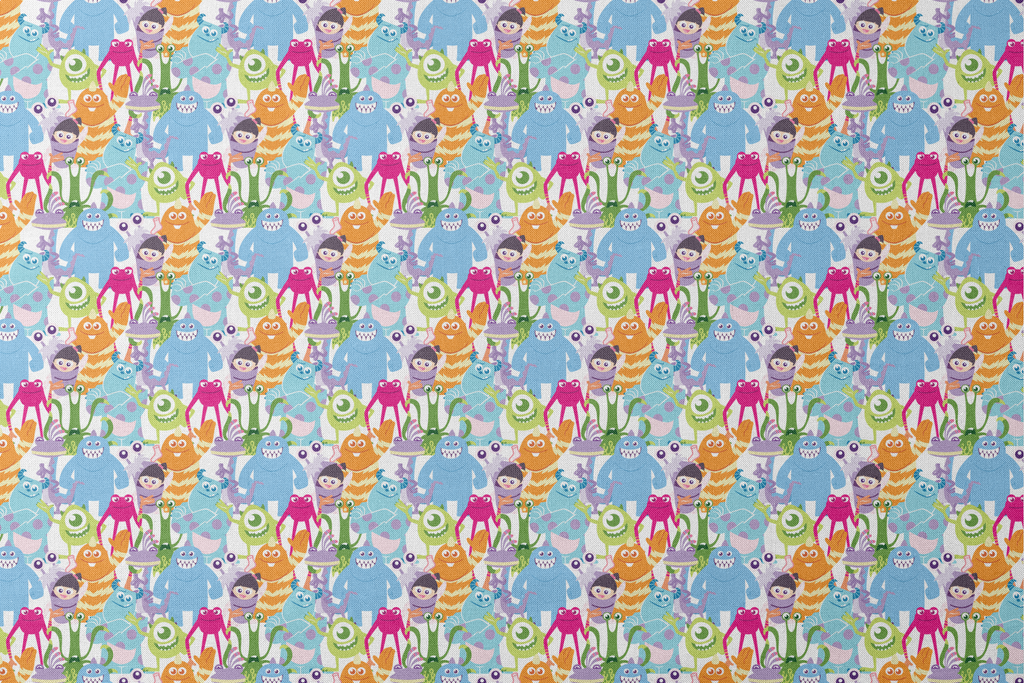 Colorful Disney and Pixar's Monsters, Inc. characters including Mike Wazowski, Sulley, and Boo in a playful all-over pattern with bright blue, green, pink, and orange colors.
