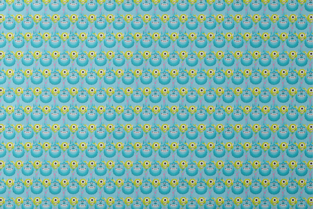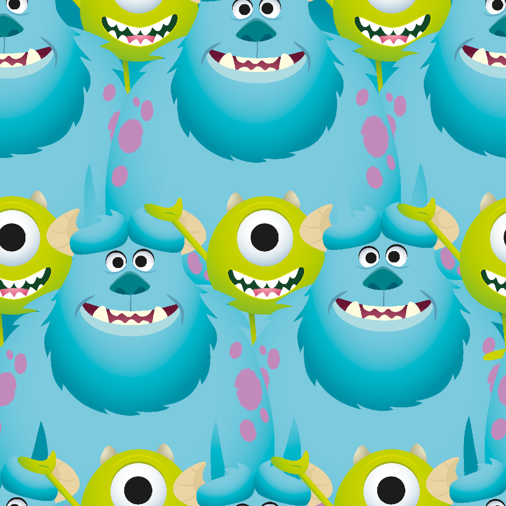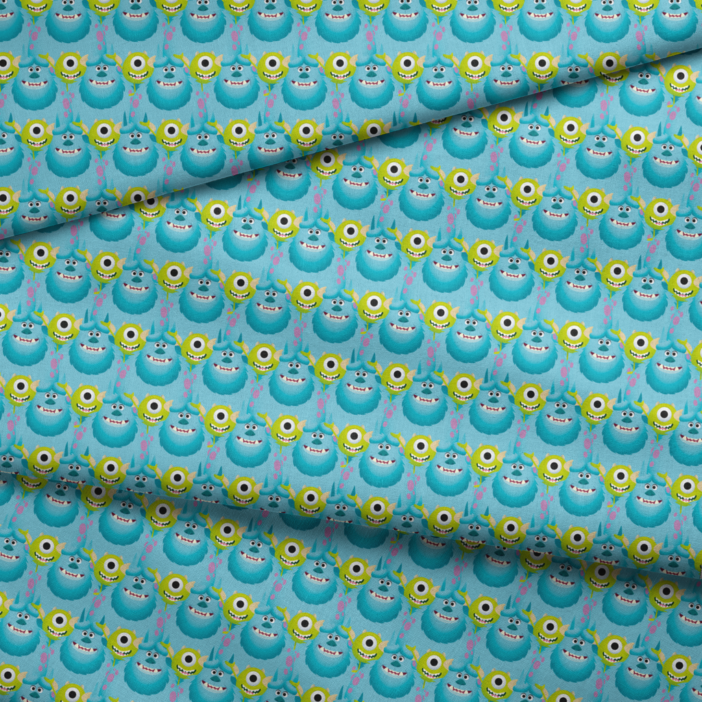 Adorable Monsters Inc pattern featuring Mike & Sulley on a light blue background. Perfect for children's decor, apparel, or monster-themed bedroom accessories.