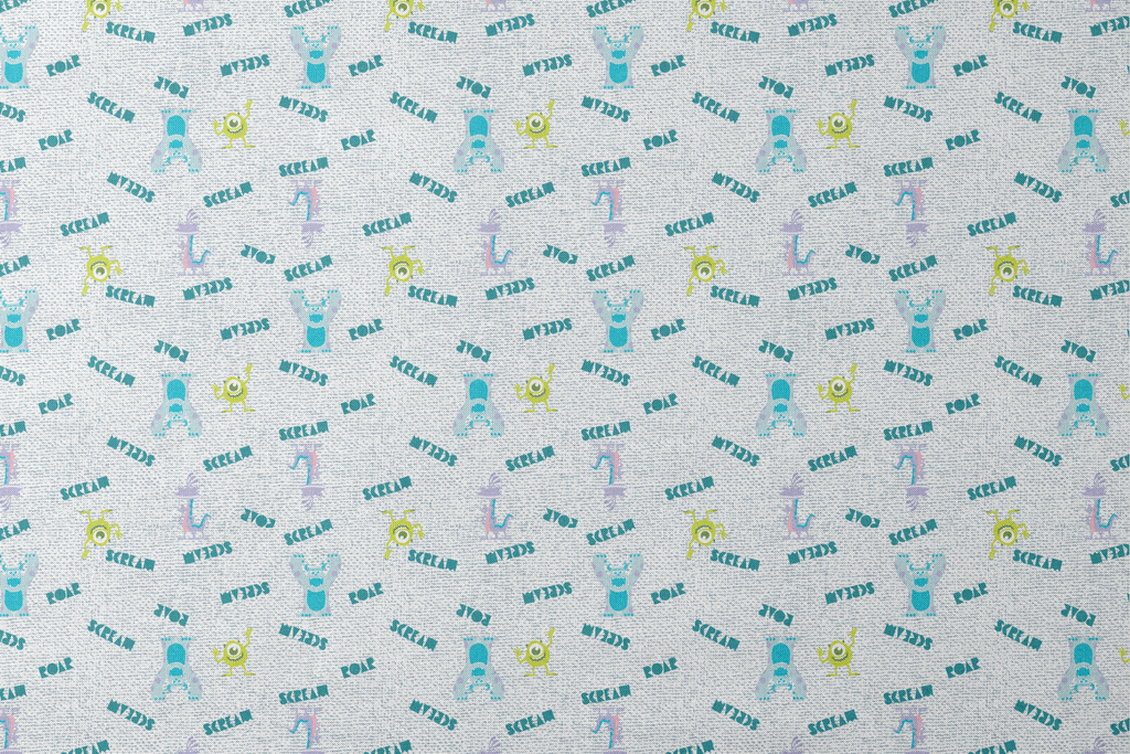 This whimsical Disney and Pixar's Monsters, Inc. inspired fabric features cute cartoon characters in turquoise and lime green scattered across a textured background, perfect for children's room decor or themed projects.