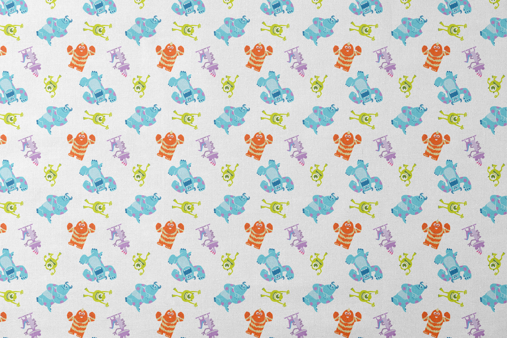 Colorful Disney and Pixar's Monsters, Inc. inspired pattern with Sulley, Mike Wazowski, and friends on a white background. Perfect for kids' apparel and home decor featuring these beloved cartoon characters.