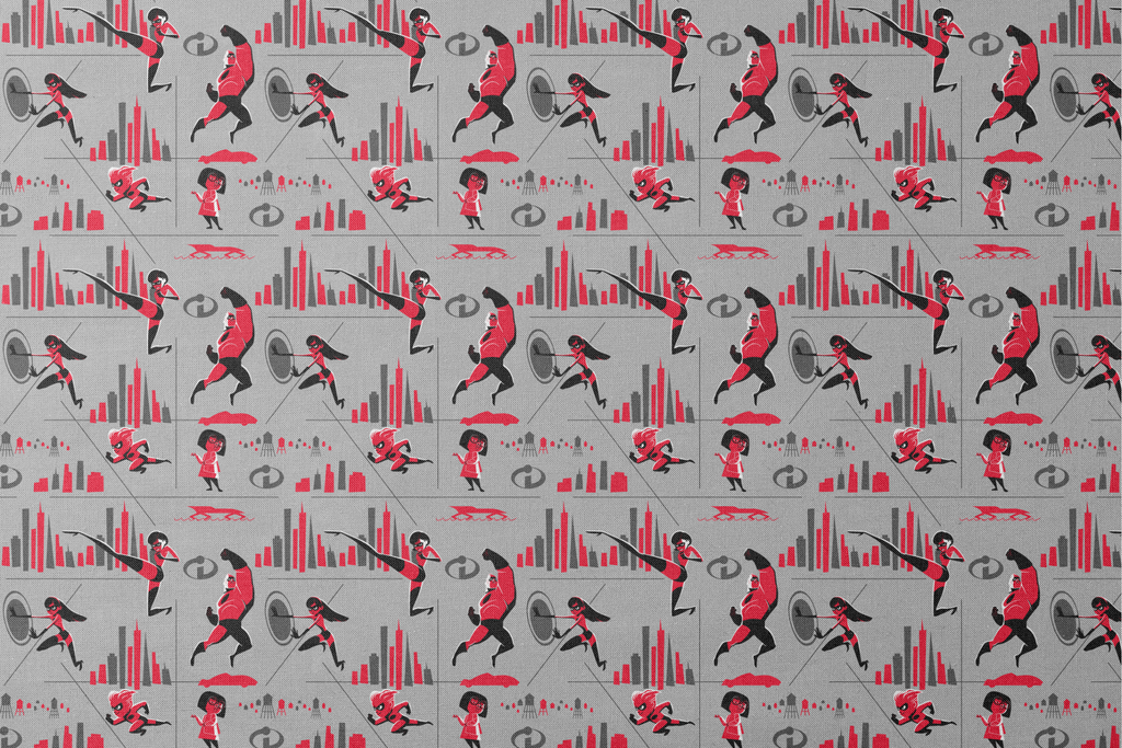 Stylish red and black superhero pattern featuring Disney and Pixar's The Incredibles characters in dynamic action poses with graphic chart elements, perfect for fans of this modern animated classic.