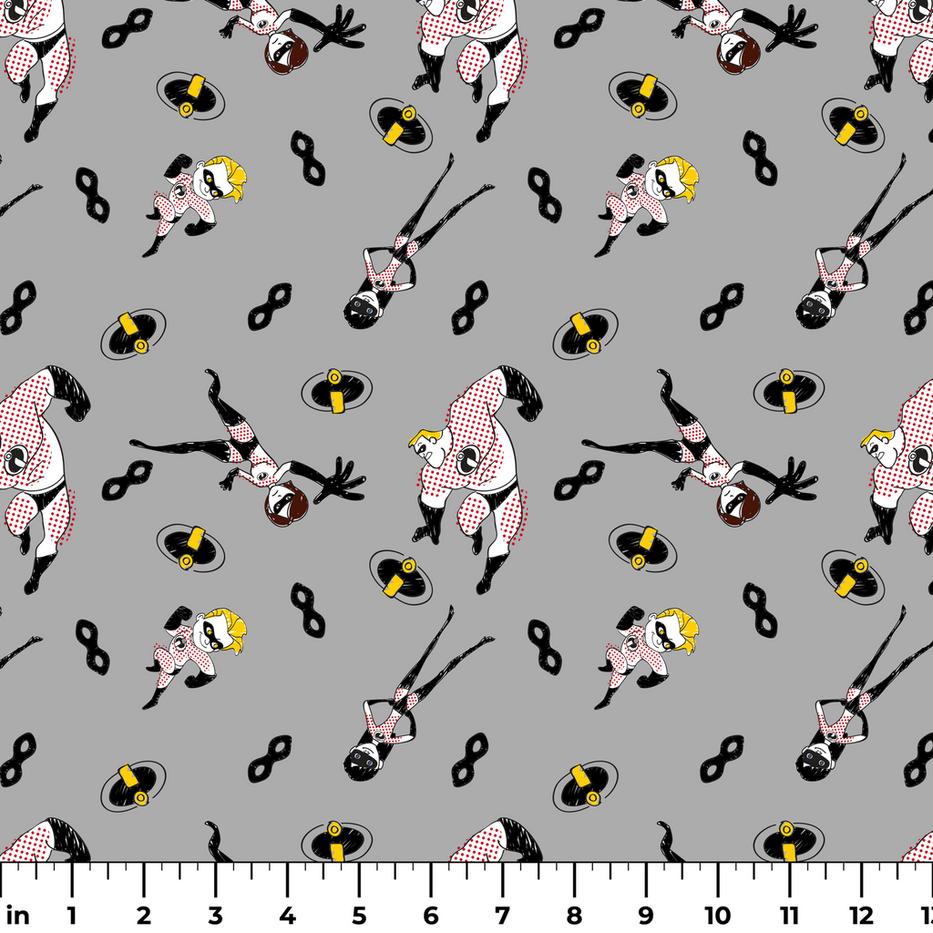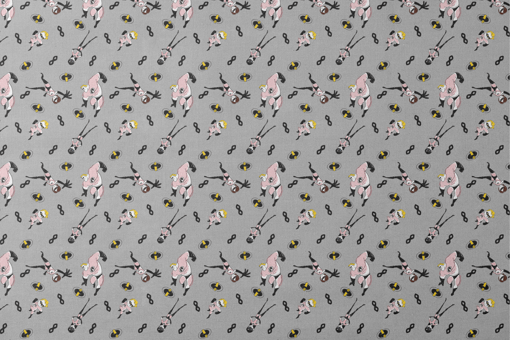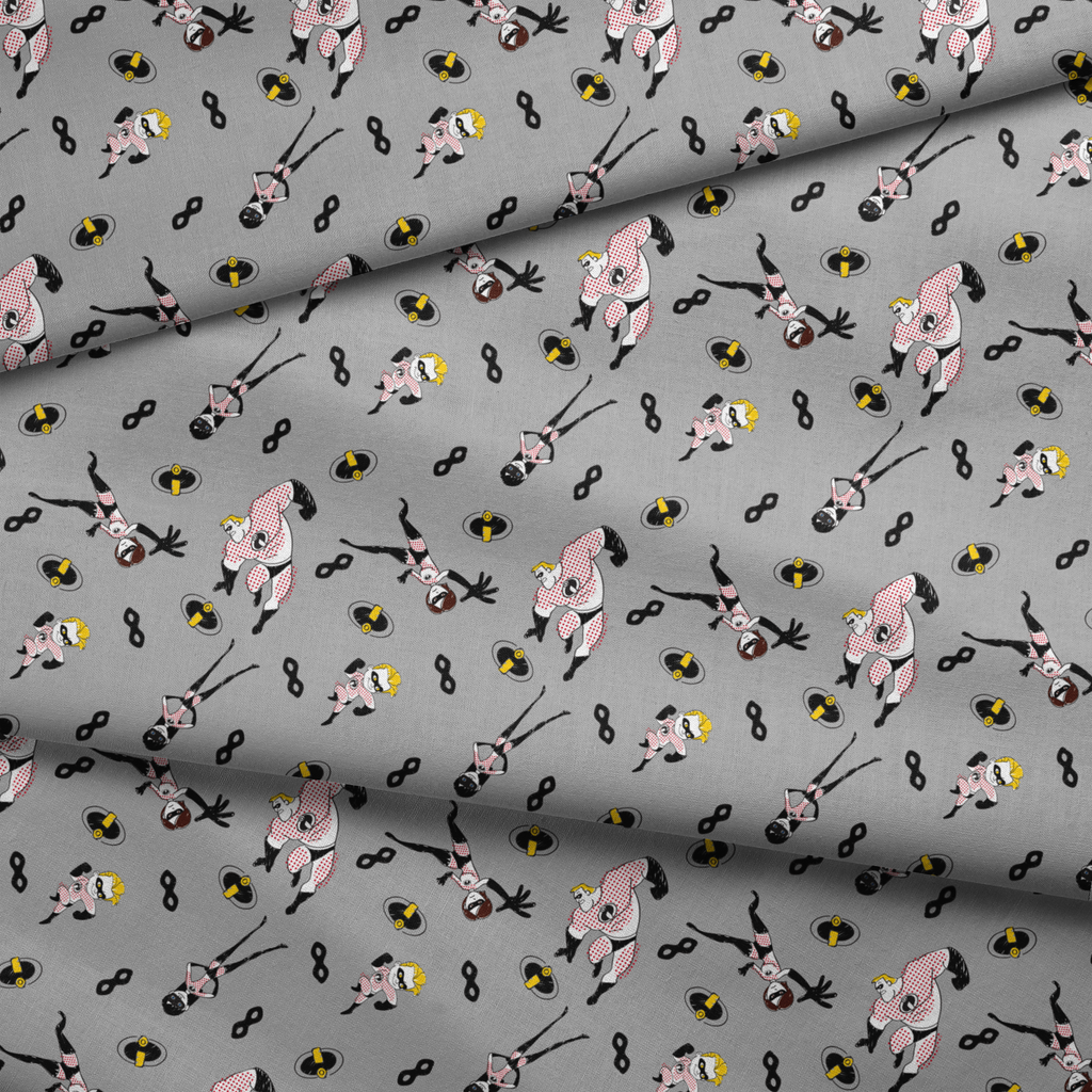 Retro superhero cartoon pattern featuring Disney and Pixar's The Incredibles in black and yellow with a vintage comic book aesthetic on a gray background. Perfect for fans of classic action heroes.