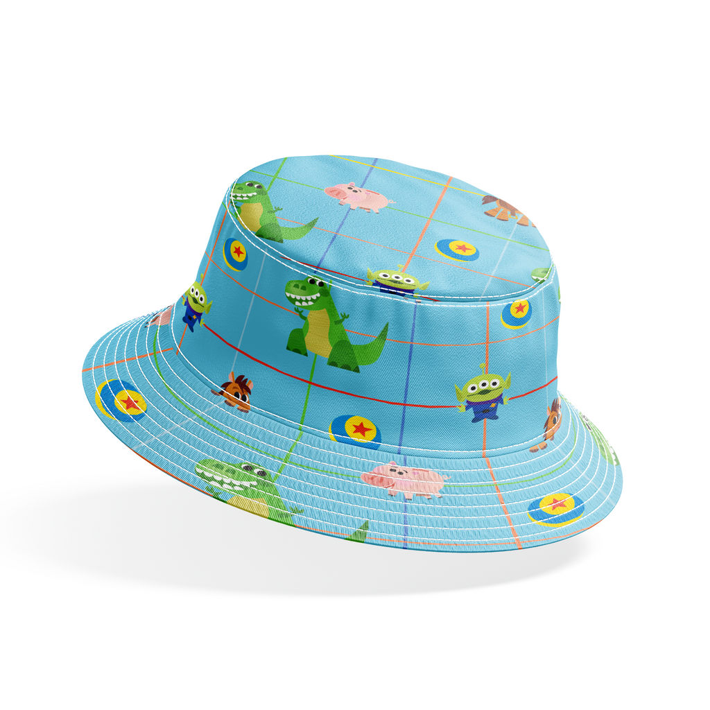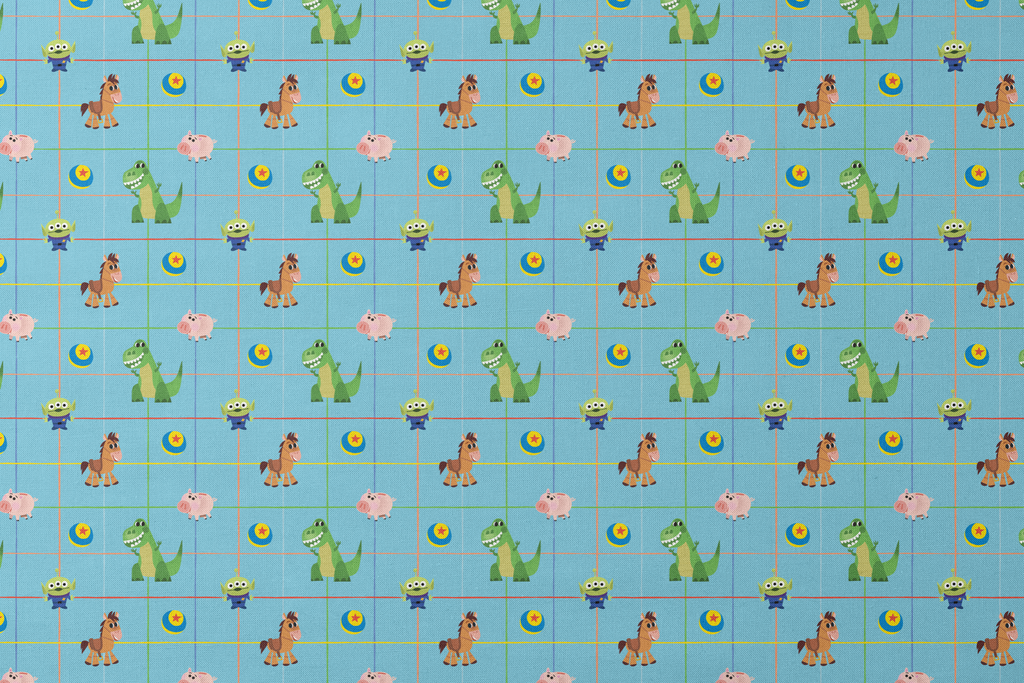 Cute Disney and Pixar's Toy Story pattern featuring Bullseye, Hamm and Rex on a blue grid background. Perfect for kids room decor.