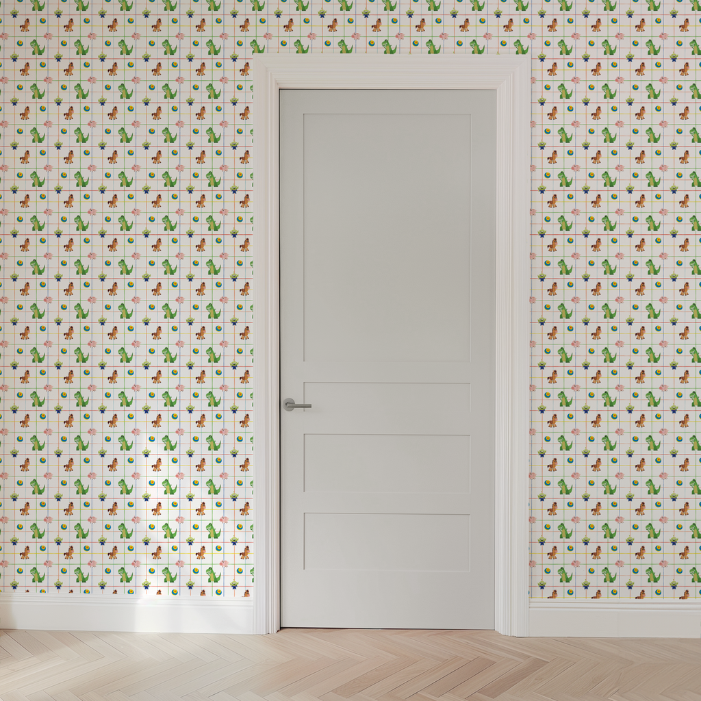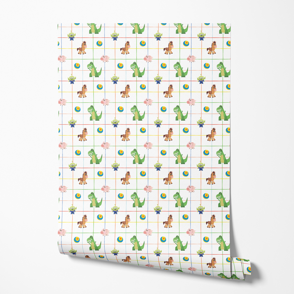 Cute Disney and Pixar's Toy Story pattern featuring Bullseye, Hamm and Rex on a white grid background. Perfect for kids' rooms.