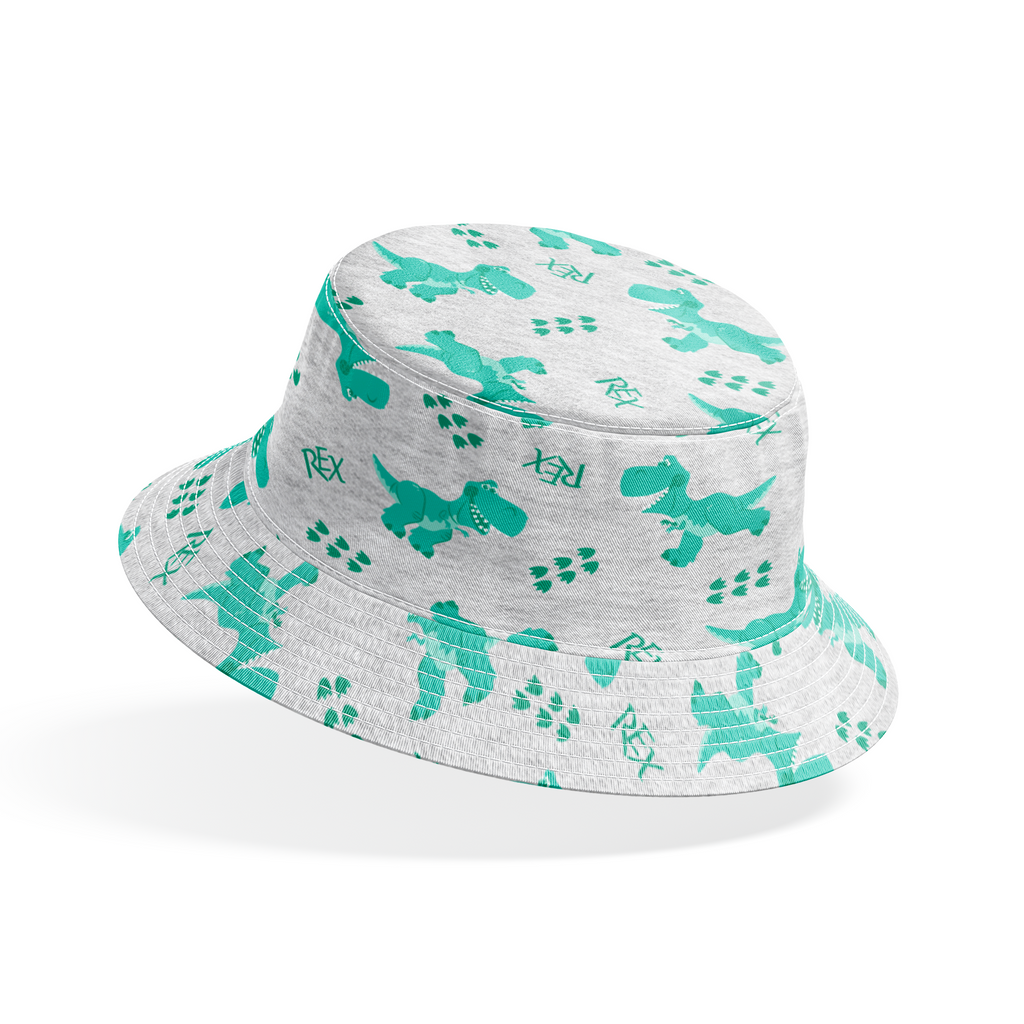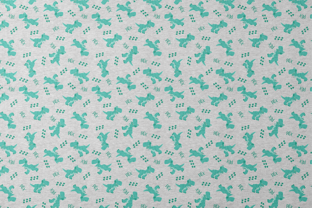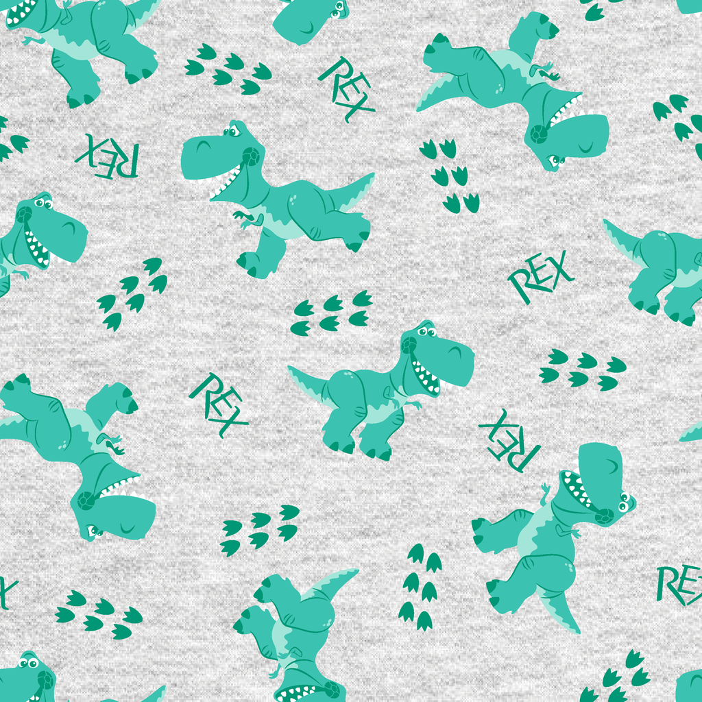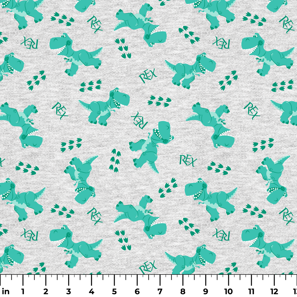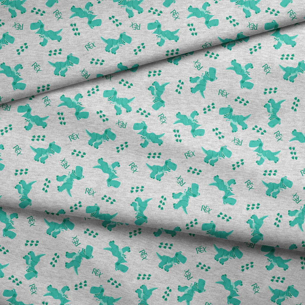 Playful Rex from Disney and Pixar's Toy Story on heathered gray fabric, perfect for children's apparel with cute T-Rex designs and footprints.