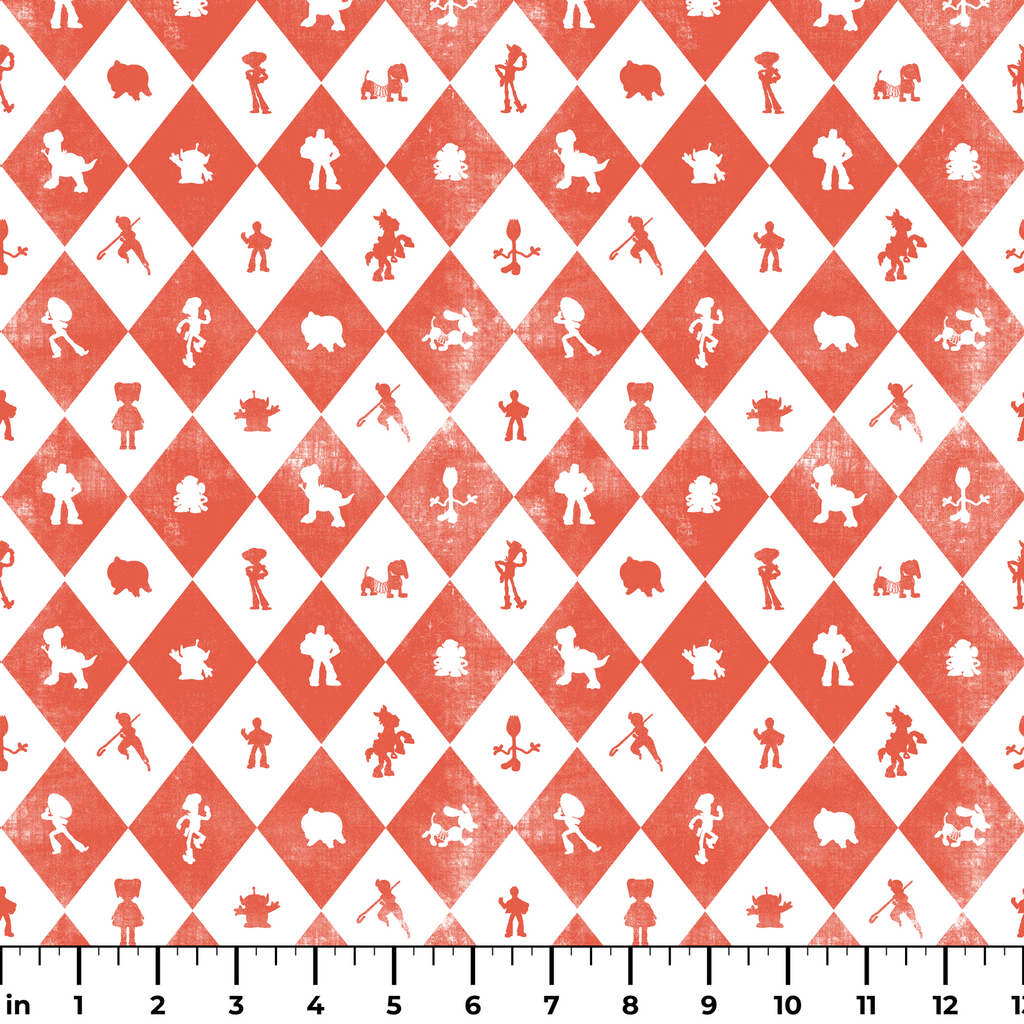 Classic red and white diamond grid featuring silhouettes of Disney and Pixar's Toy Story characters like Buzz, Woody, Rex and more in a playful retro style. Perfect for nursery decor or children's rooms.