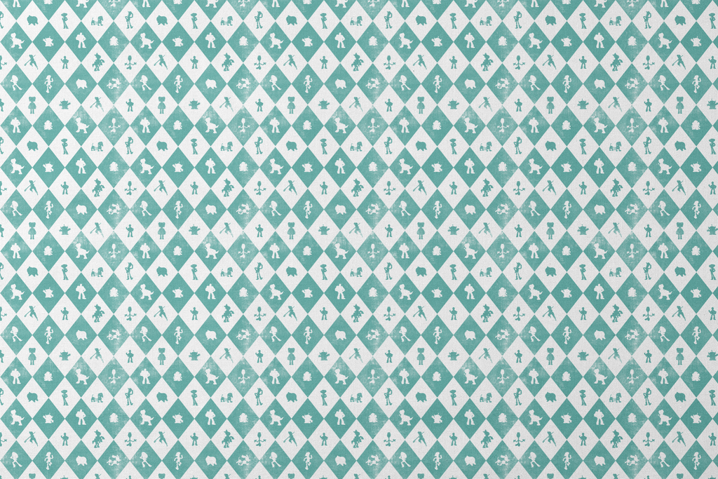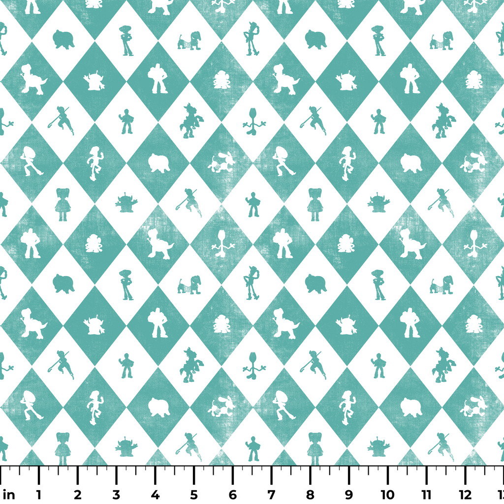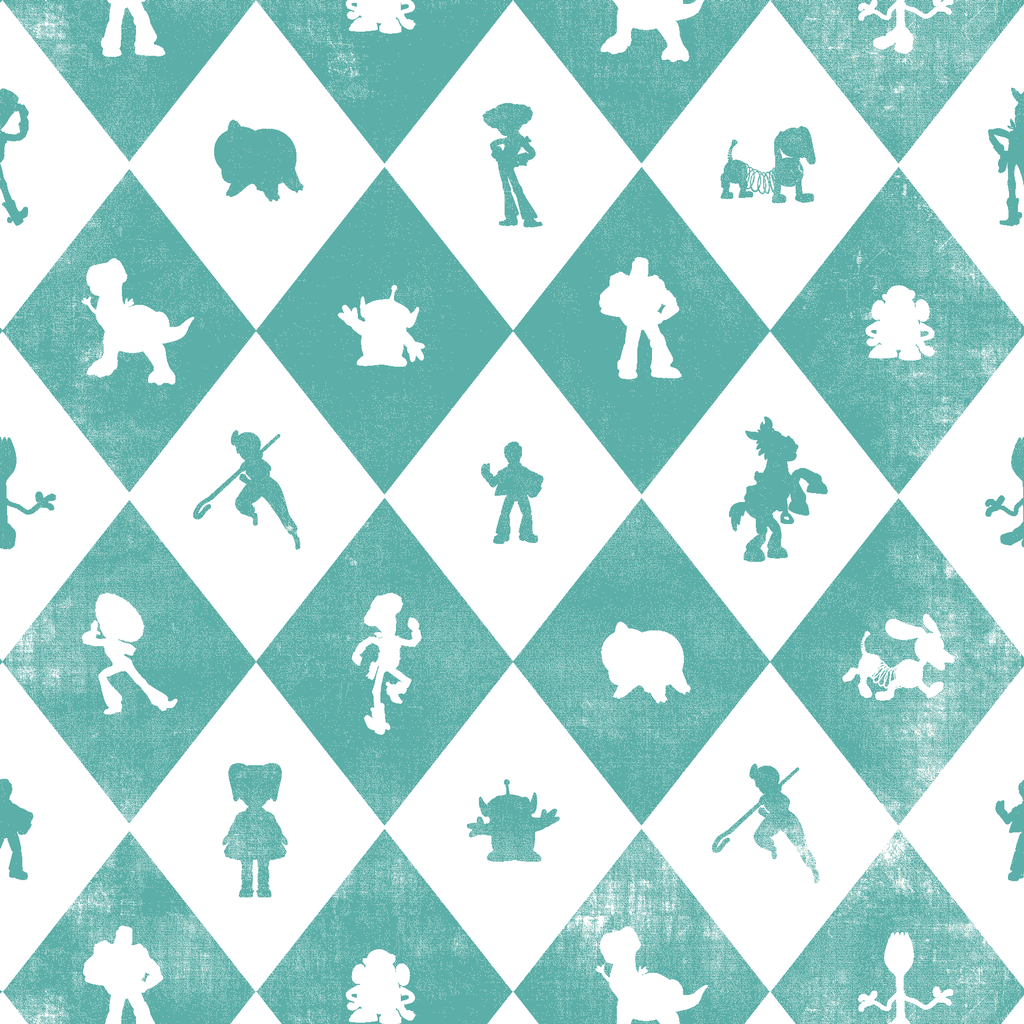 Classic teal and white diamond grid featuring silhouettes of Disney and Pixar's Toy Story characters like Buzz, Woody, Rex and more in a playful retro style. Perfect for nursery decor or children's rooms.