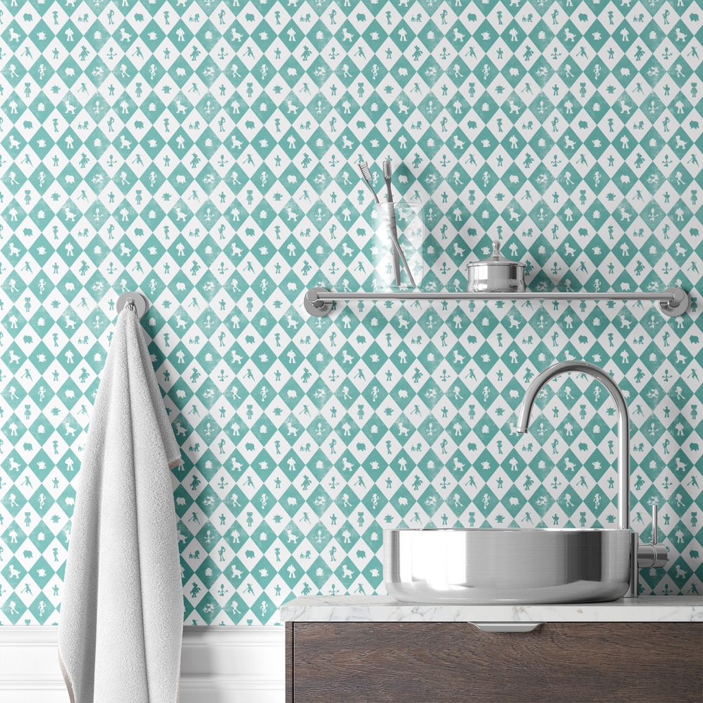 Classic teal and white diamond grid featuring silhouettes of Disney and Pixar's Toy Story characters like Buzz, Woody, Rex and more in a playful retro style. Perfect for nurseries or children's rooms.