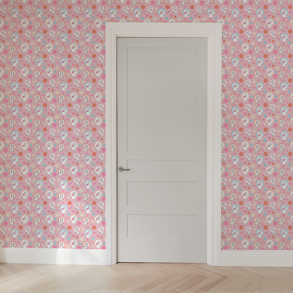 Sweet Marie from The Aristocats on a pastel pink background with polka dots and bows. This whimsical, feminine pattern features the adorable feline character in decorative circular frames.