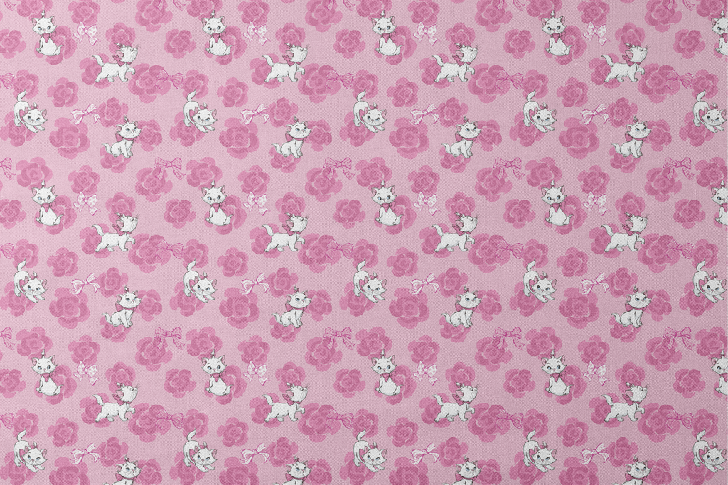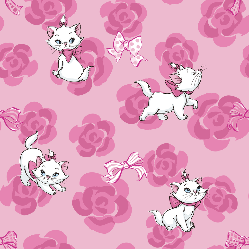 Adorable Marie from The Aristocats with pink bows frolic on a pastel pink floral background, creating a whimsical and playful pattern perfect for children's apparel or nursery decor.