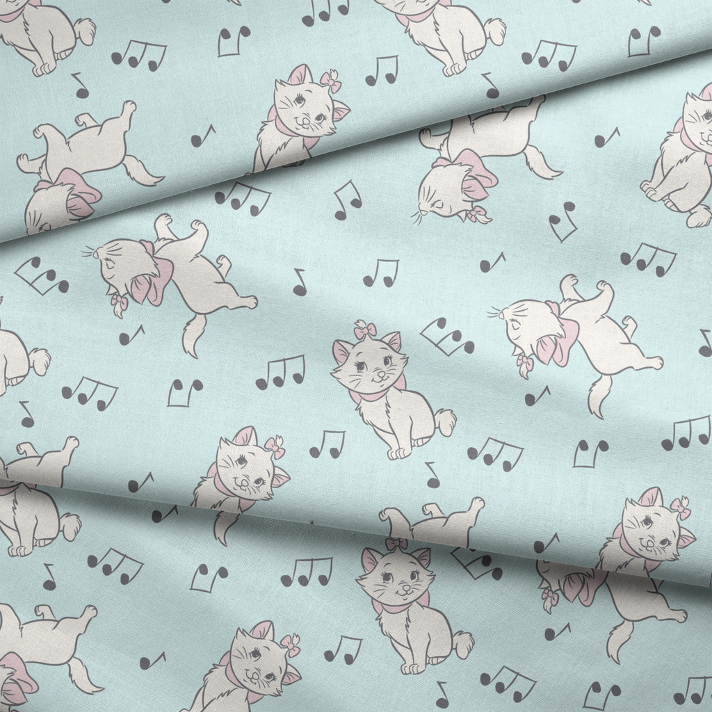 Adorable Marie playfully dance against a mint background filled with musical notes. Perfect for a whimsical nursery or children's apparel with its sweet, playful aesthetic.