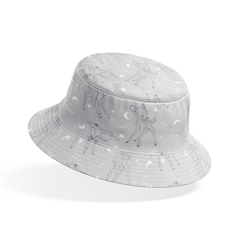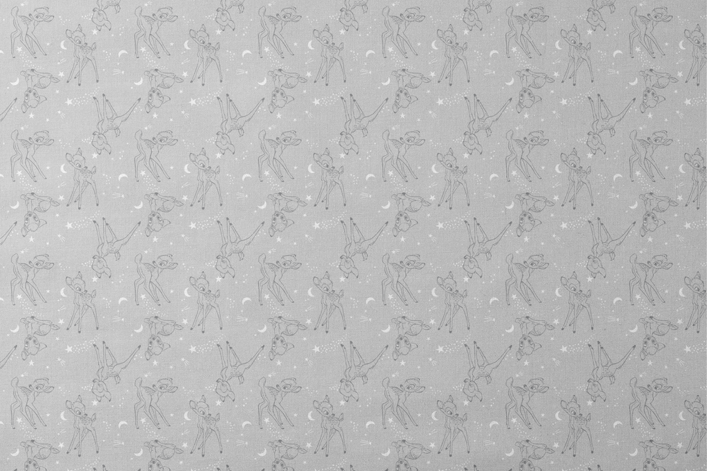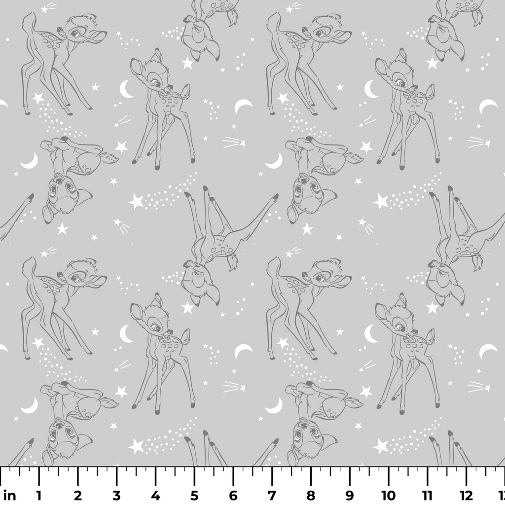 Adorable woodland Disney's Bambi characters on a soft gray background with whimsical stars and moons. Perfect for nursery decor with a charming storybook aesthetic. ©Disney