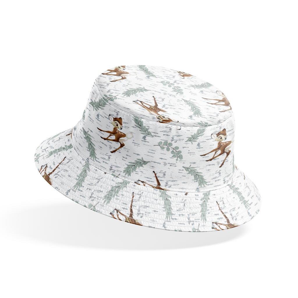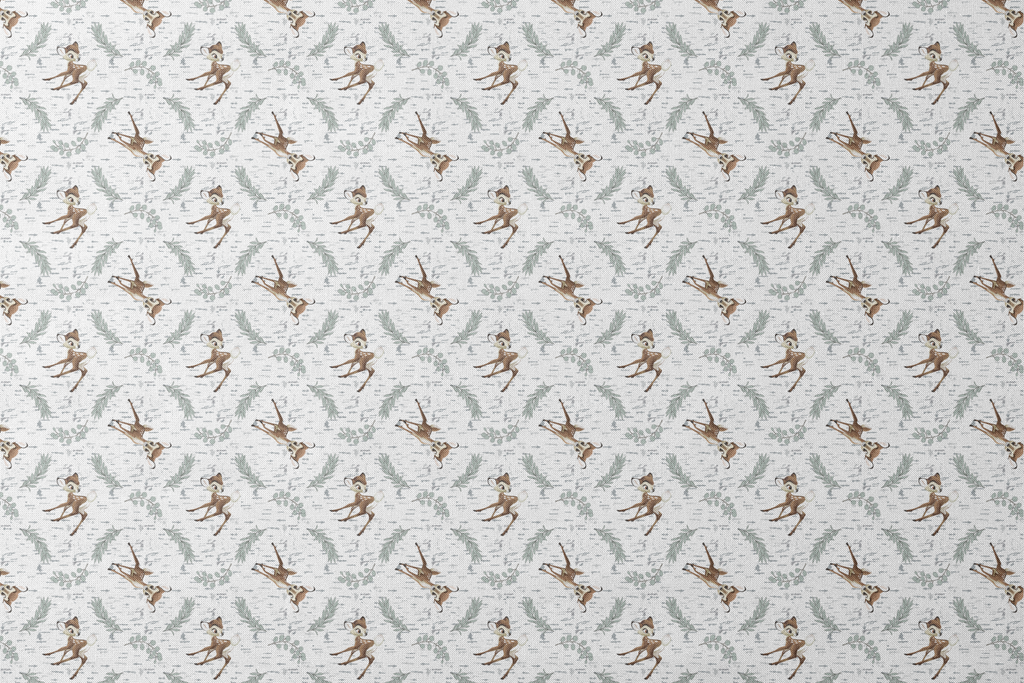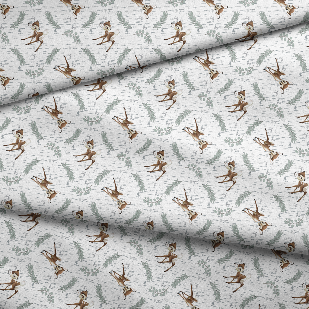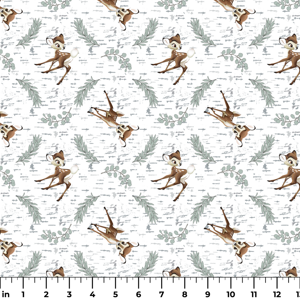 Officially licensed Disney's Bambi fabric featuring Bambi with sage green botanical sprigs and birch bark accents on white. ©Disney