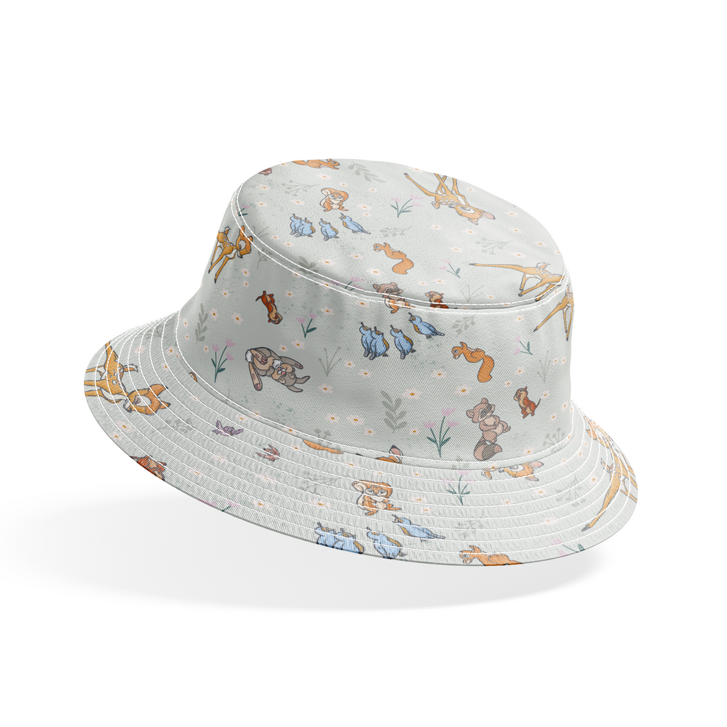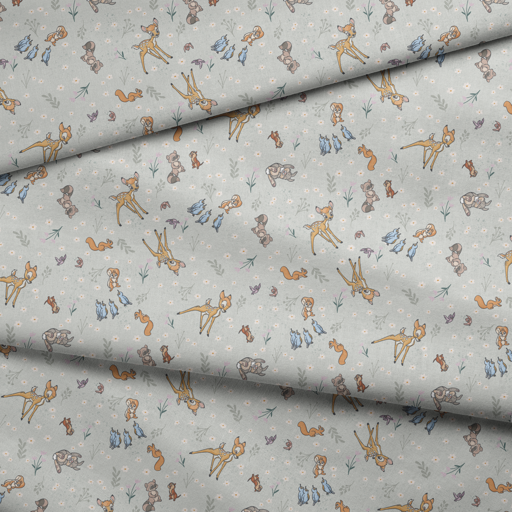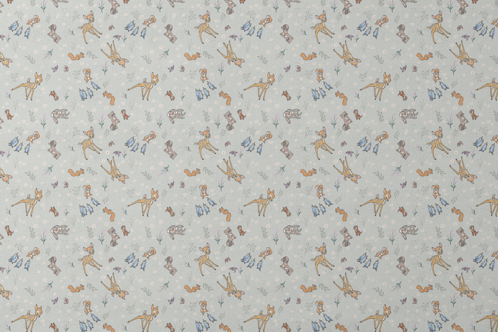 This enchanting Disney's Bambi-themed fabric features beloved woodland characters scattered across a soft sage green background. Adorable deer, playful rabbits, curious blue birds, and tiny squirrels frolic among delicate white daisies and gentle botanical elements. The muted palette of caramel browns, soft blues, and hints of lavender creates a nostalgic yet fresh nursery aesthetic that's perfect for baby blankets, quilts, or children's room decor.