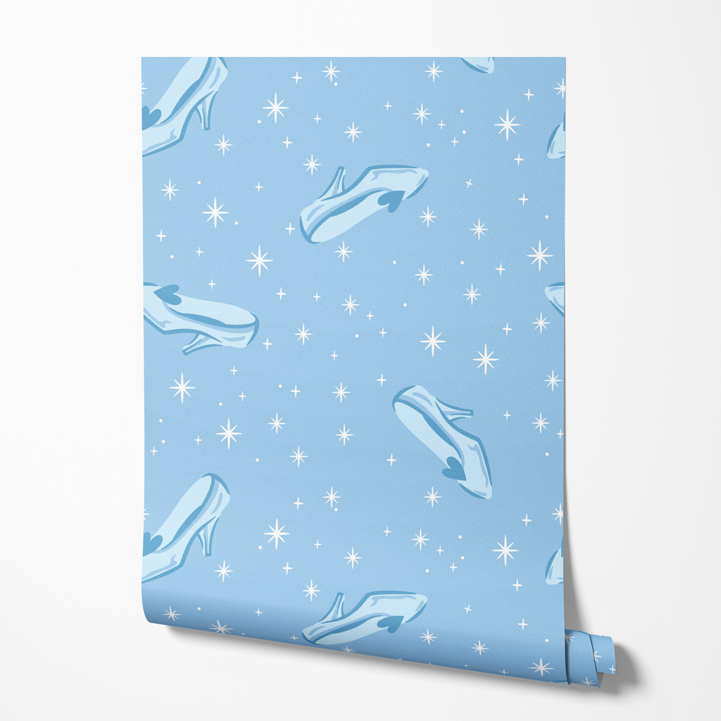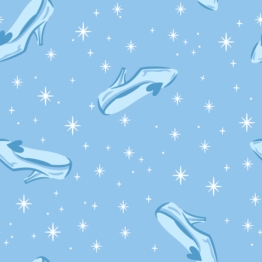 Disney Cinderella glass slippers pattern on light blue background with twinkling stars creates a dreamy fairytale aesthetic perfect for princess-themed decor.