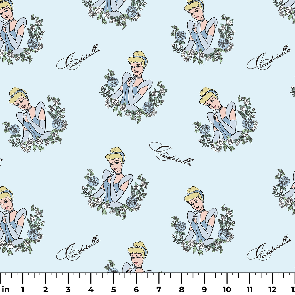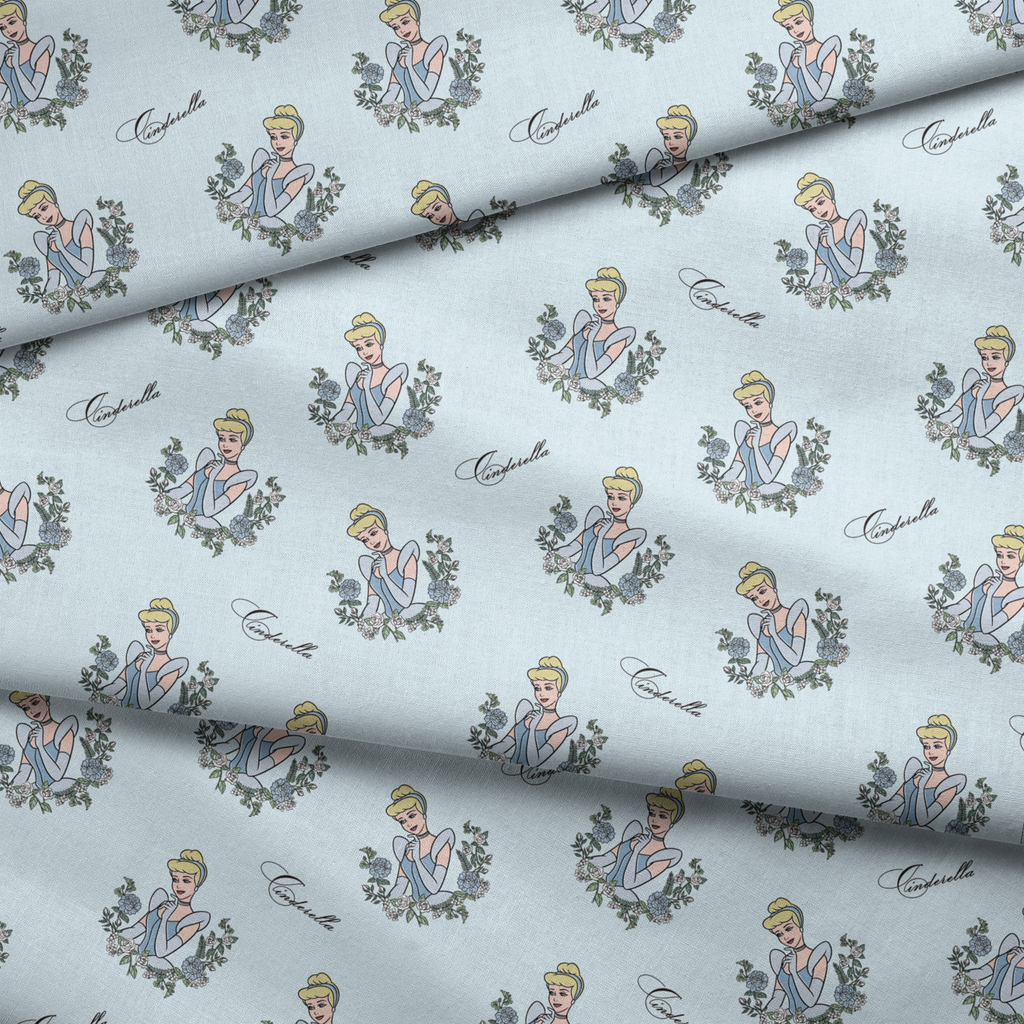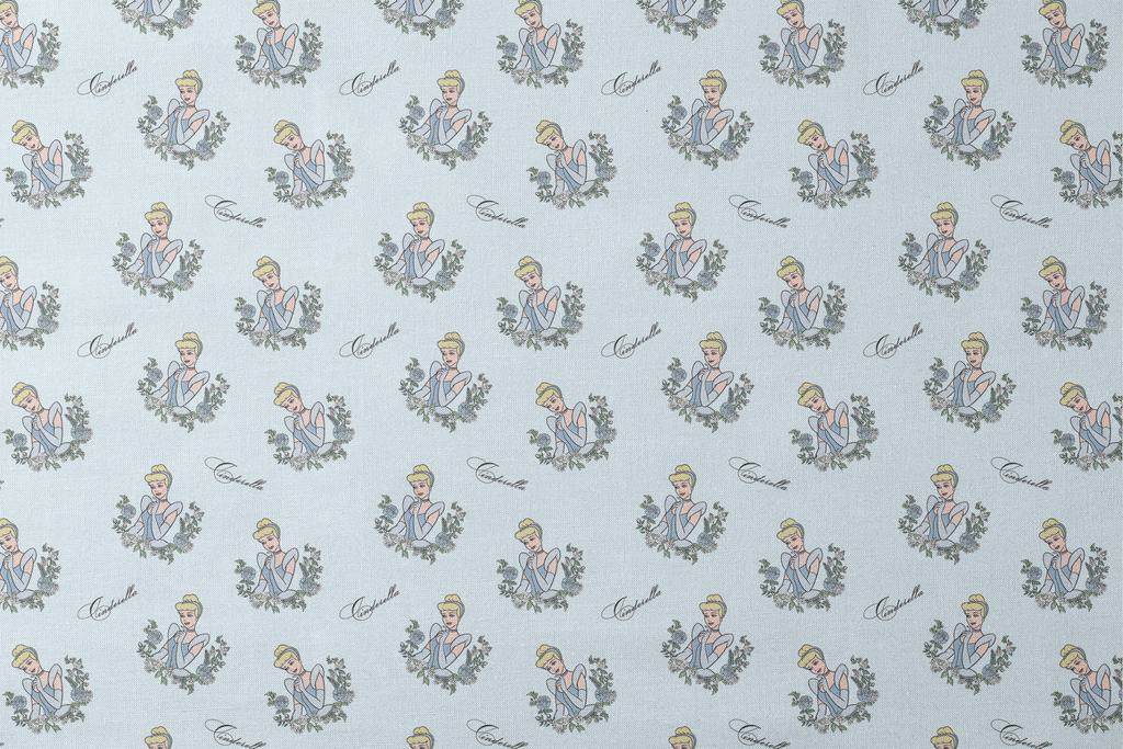 Enchanting Disney Princess-inspired pattern featuring Cinderella princesses in blue gowns, surrounded by delicate green wreaths on a light blue background, perfect for whimsical children's decor.