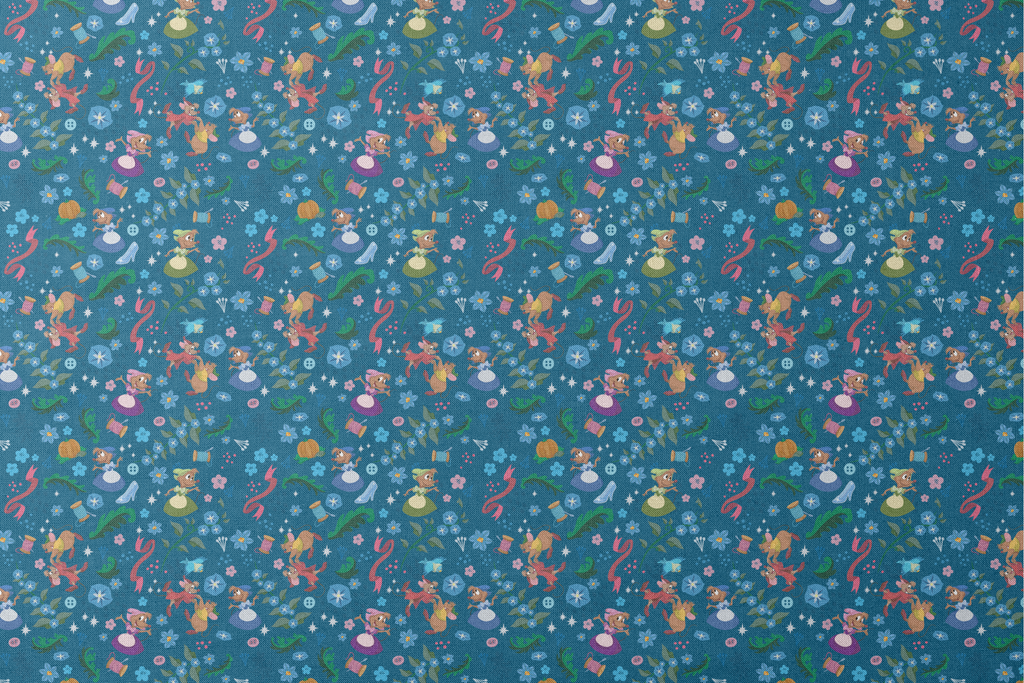 Magical fairy tale pattern with Cinderella's mouse friends, glass slippers, and whimsical elements on deep blue background. Perfect for princess-themed decor or children's clothing.