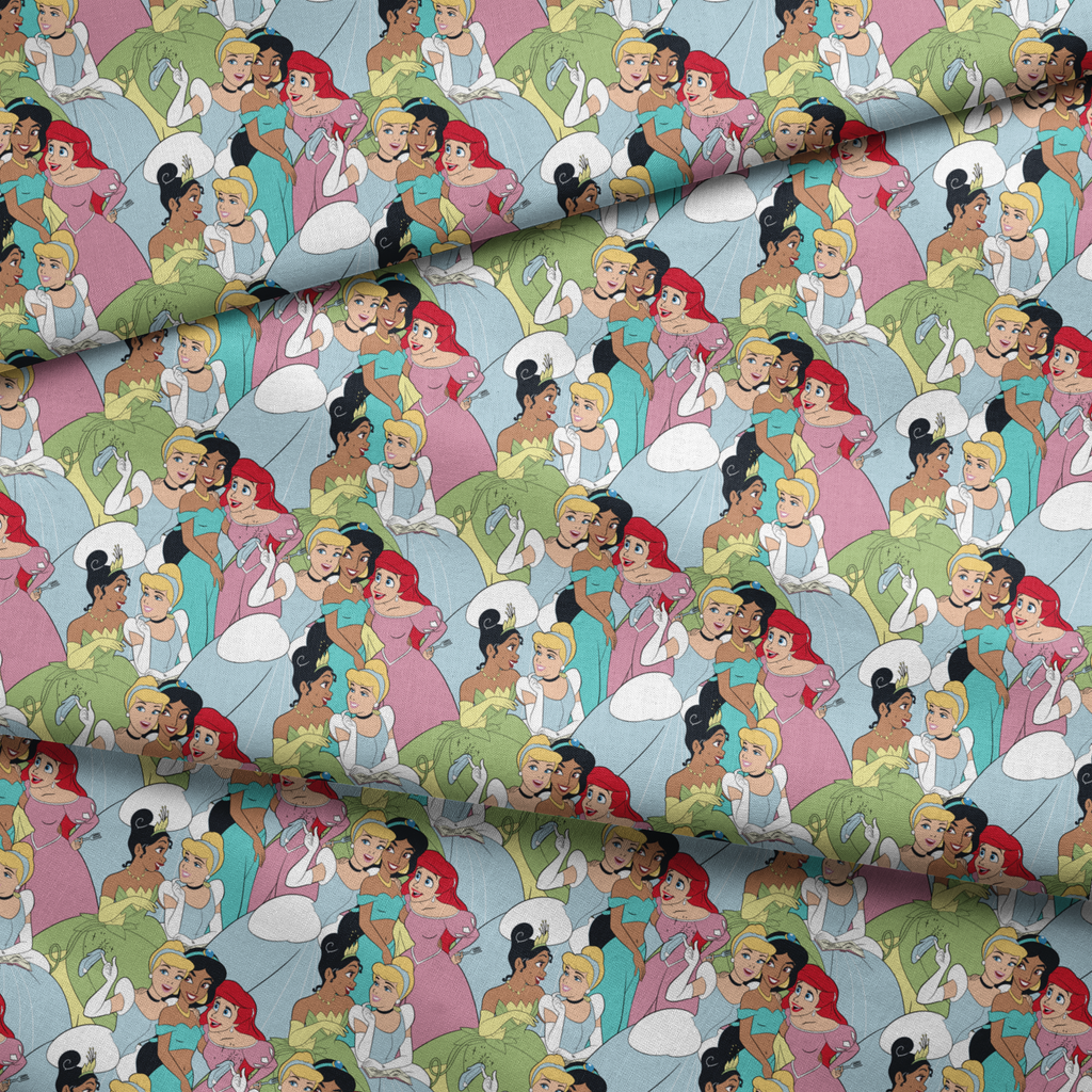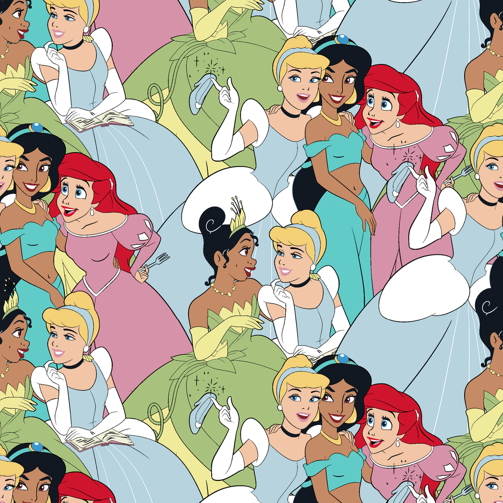 This colorful pattern features animated Disney Princesses - Cinderella, Jasmine, Ariel and Tiana in elegant ballgowns and suits with a tropical twist, perfect for fans of classic animated fairy tale movies and princess-themed decor.
