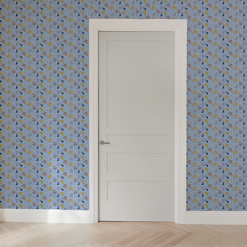 This playful Disney Dogs and Cats pattern features adorable favorite characters in various poses and colors on a blue grid background, perfect for nurseries and children's rooms.