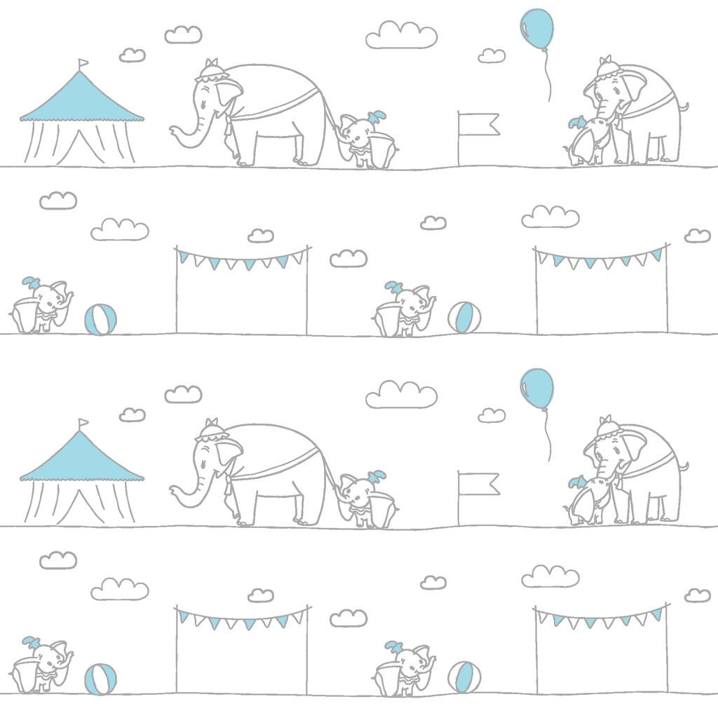 Disney Dumbo pattern featuring Dumbo and playful scenes with tents, balloons, and bunting flags. Perfect for nursery decor or children's rooms.