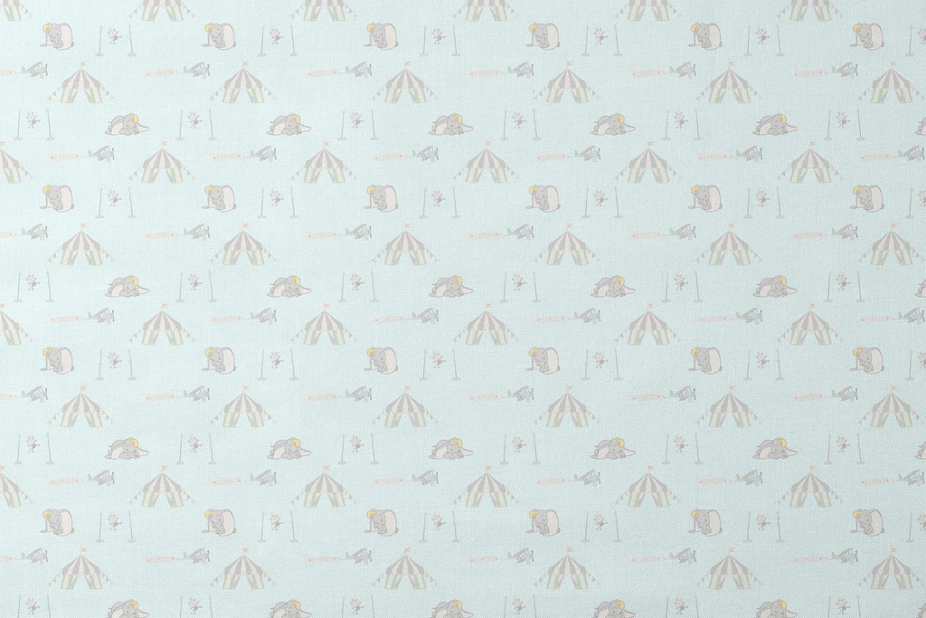 Delicate circus-themed pattern featuring Dumbo with acrobats, vintage airplanes and circus tents in soft, pastel colors perfect for a nursery or children's room.