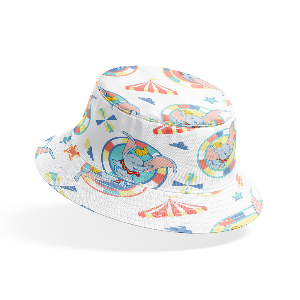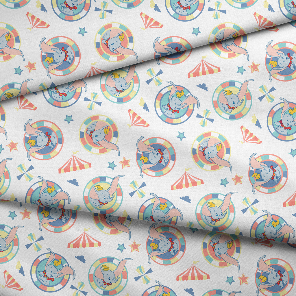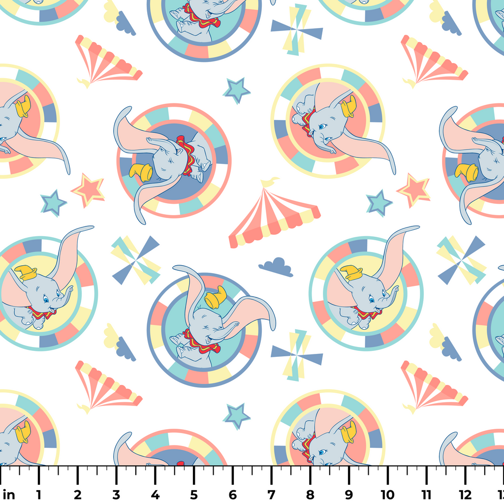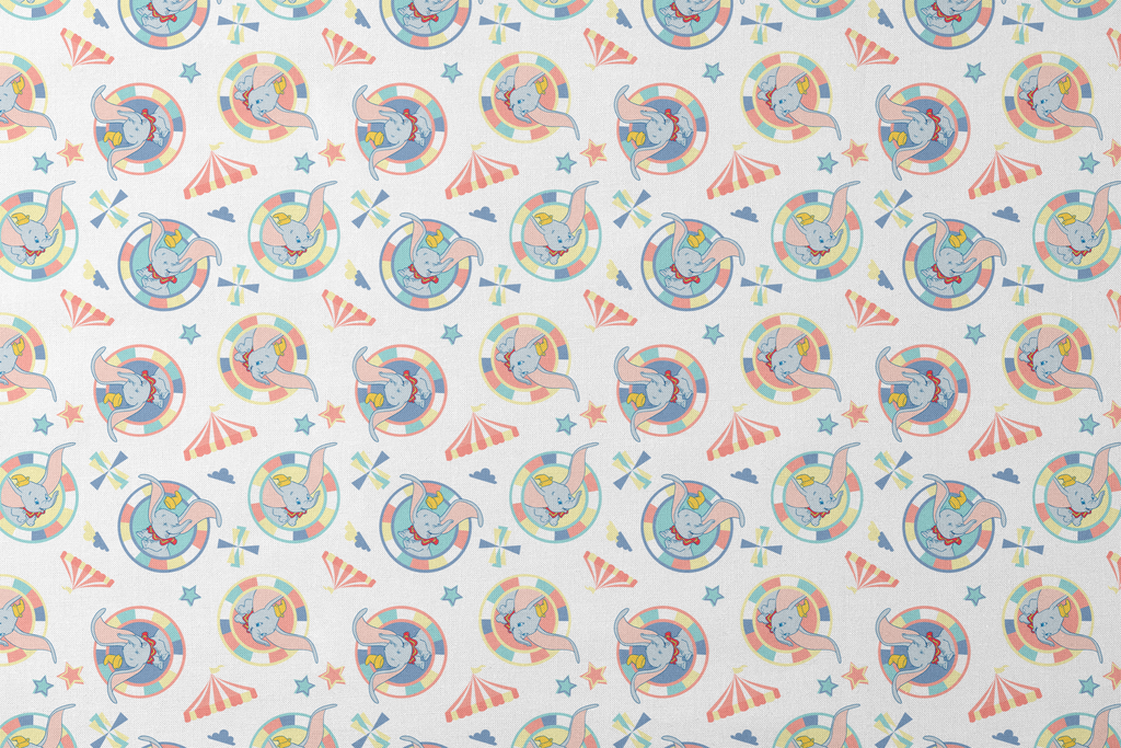 Whimsical circus-themed pattern featuring adorable Dumbo in colorful circular frames, with decorative stars and circus tent elements on a crisp white background.