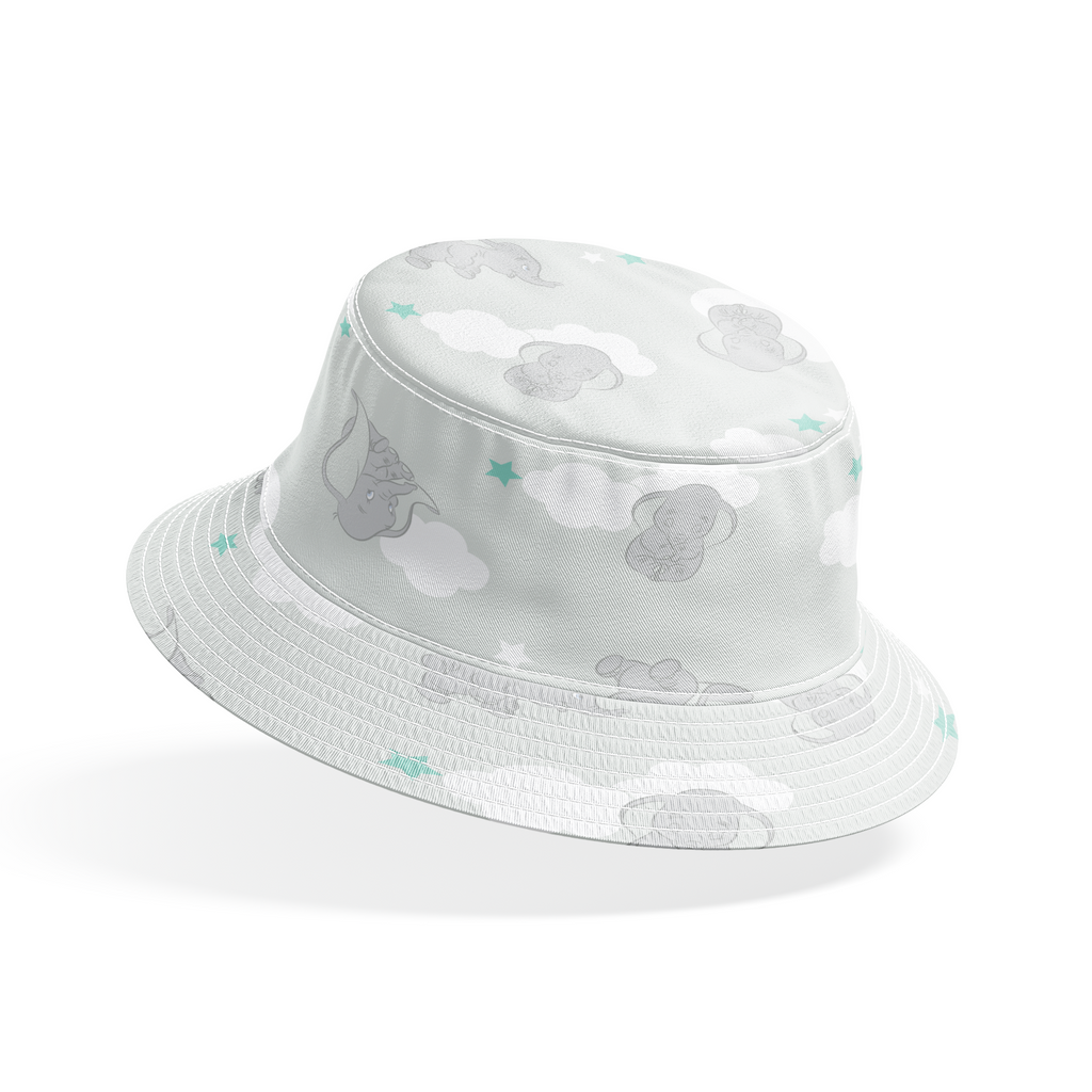 Adorable Disney Dumbo pattern featuring the sweet baby elephant amid fluffy clouds and stars on a soft gray background - perfect for nursery decor or children's rooms.