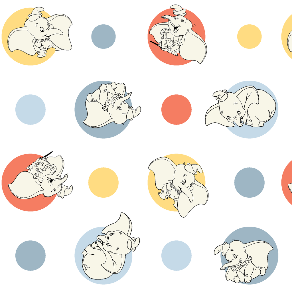 Adorable Dumbo playfully arranged on colorful blue, yellow, and coral circular backgrounds create a whimsical pattern perfect for nursery decor or children's apparel.