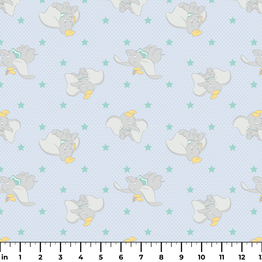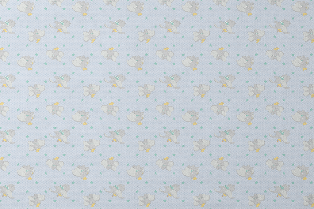 Sweet Dumbo-inspired elephant print with adorable mint stars on a soft blue background, perfect for a nursery or children's room.