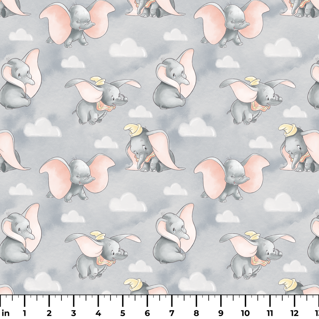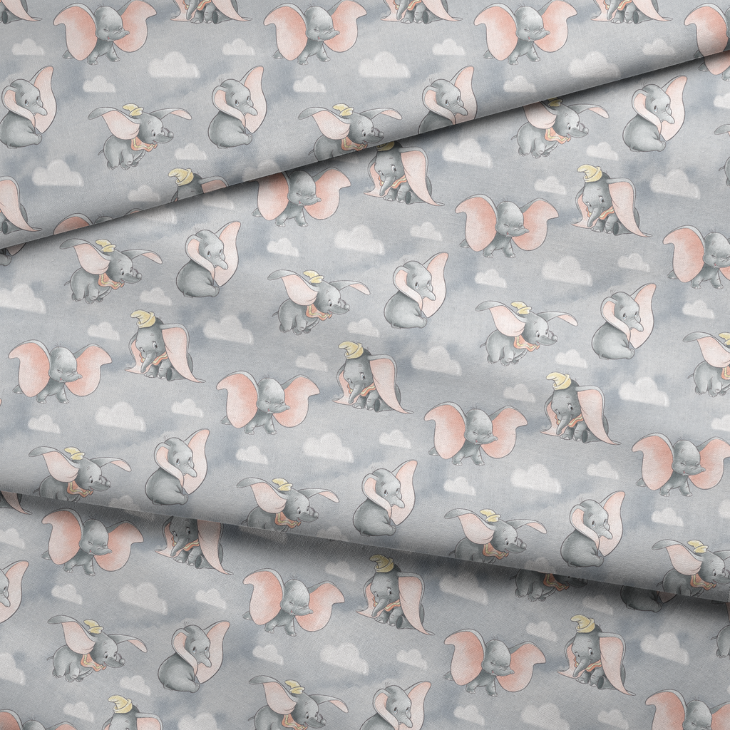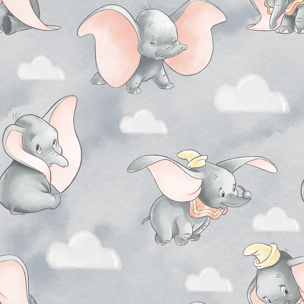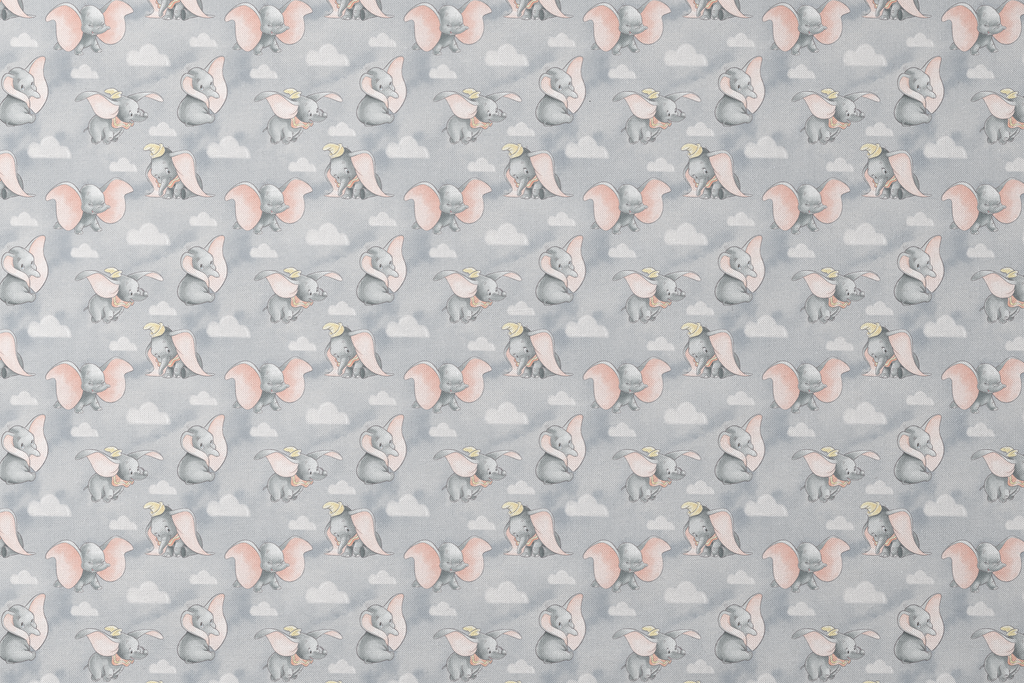 Delightful flying Dumbo pattern with adorable baby elephants soaring through cloudy skies in soft gray and pink tones - perfect for nursery decor or children's clothing.