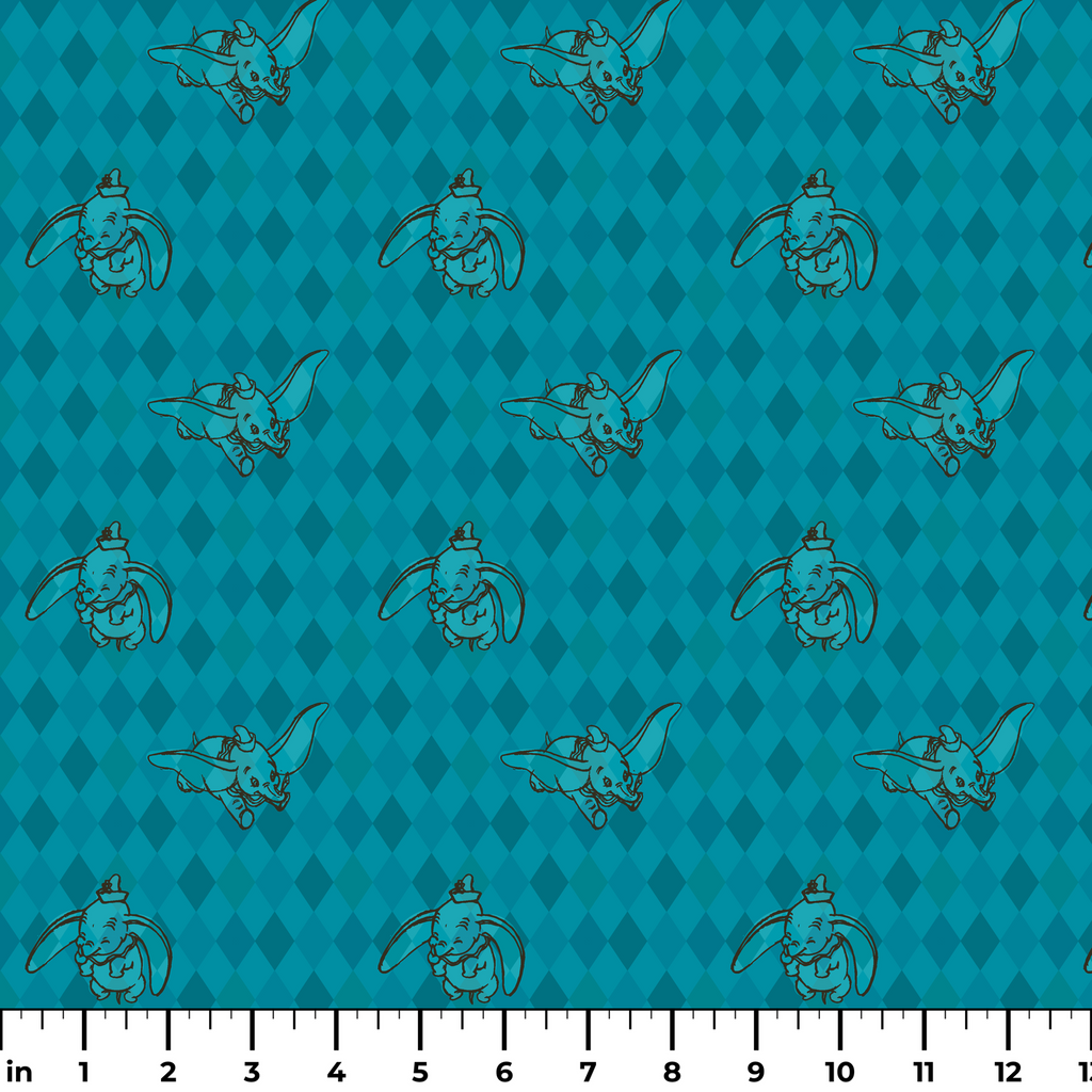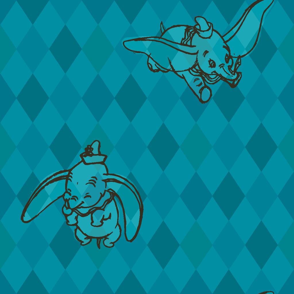 Whimsical flying Dumbo soar across a turquoise diamond pattern background, creating a playful, contemporary design perfect for children's decor or apparel.