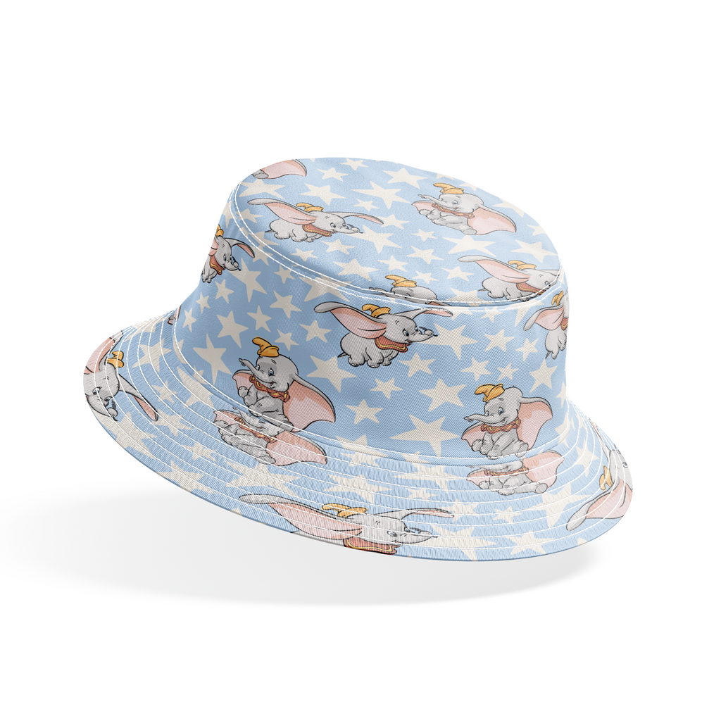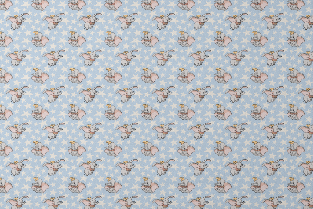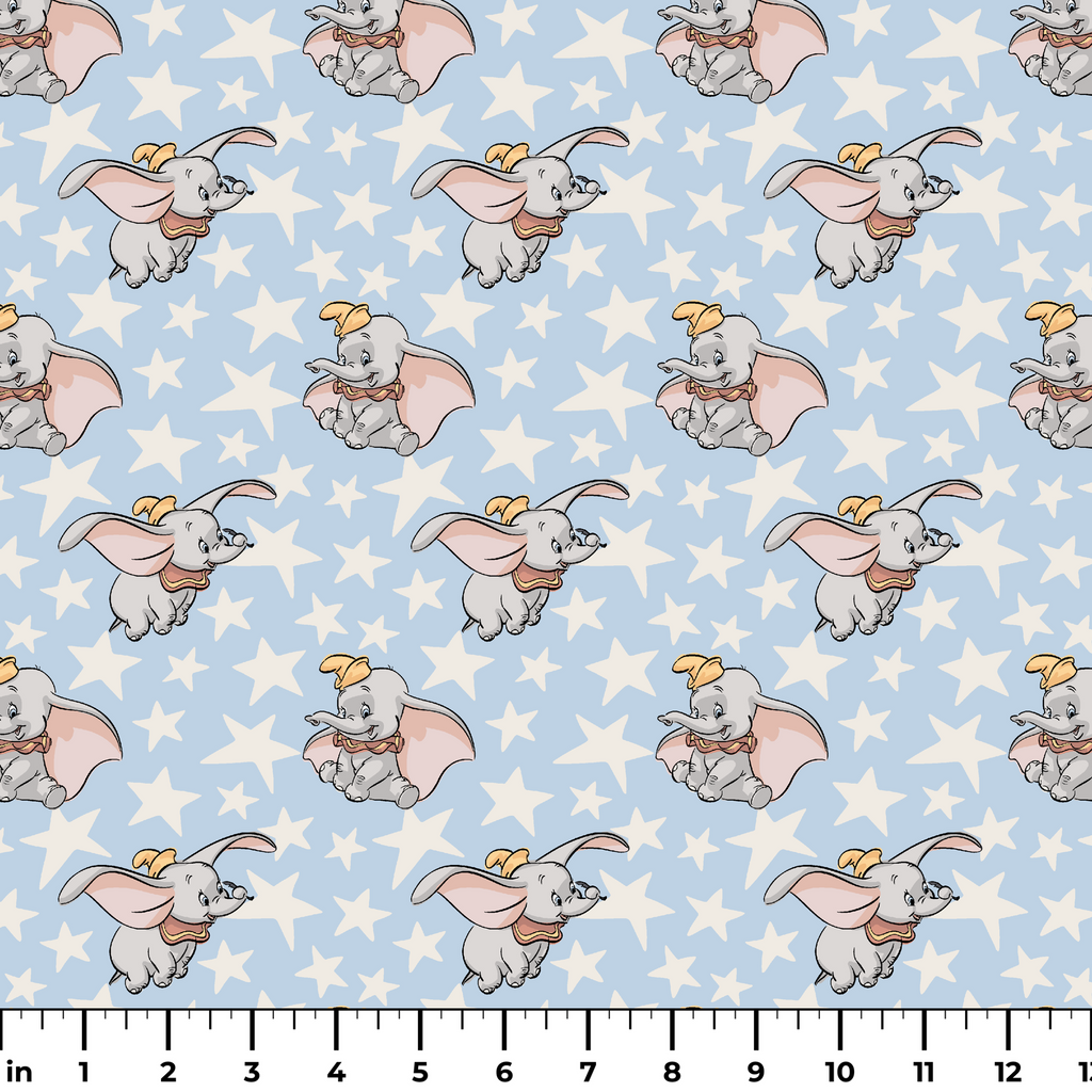 Cute flying Dumbo soars against a light blue background with white stars, creating a whimsical Disney-inspired pattern perfect for nursery decor or children's apparel.