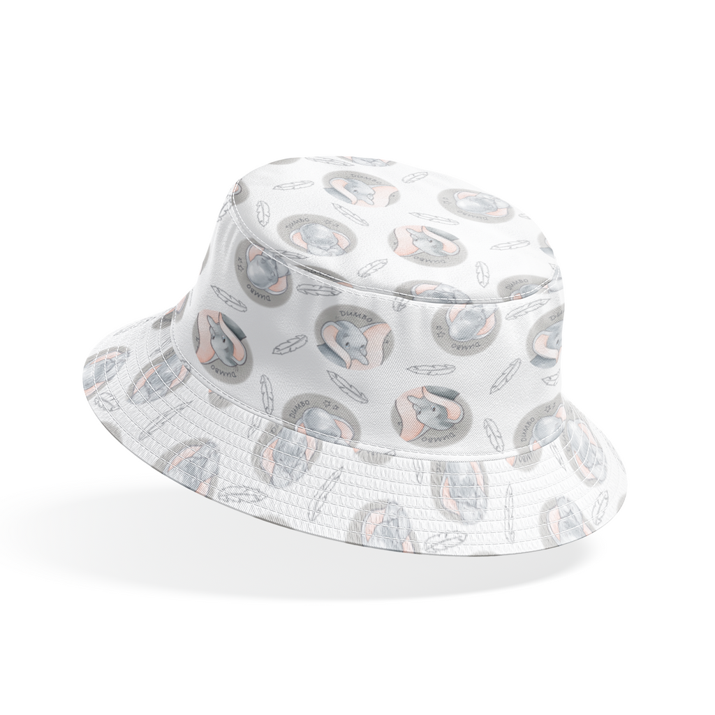 Sweet Dumbo elephant design with gray circular motifs and delicate feather details on a soft pastel background. Perfect for nursery decor or children's apparel.