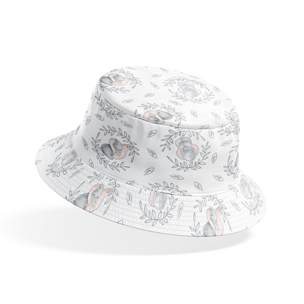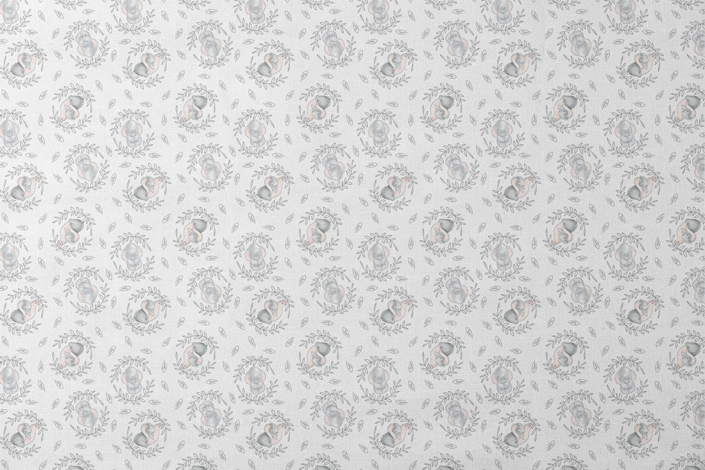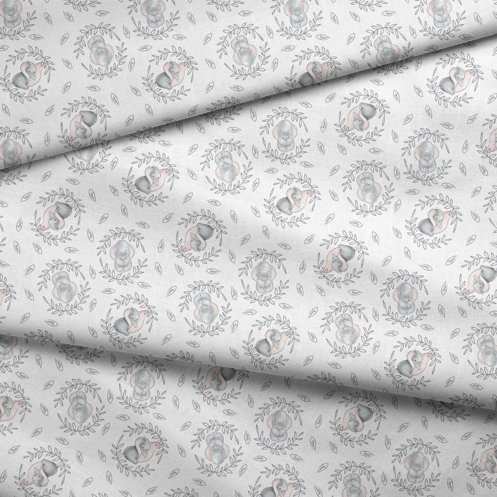 Sweet Dumbo nestled in delicate floral wreaths create a whimsical pattern in soft gray tones, perfect for nursery decor or children's clothing.