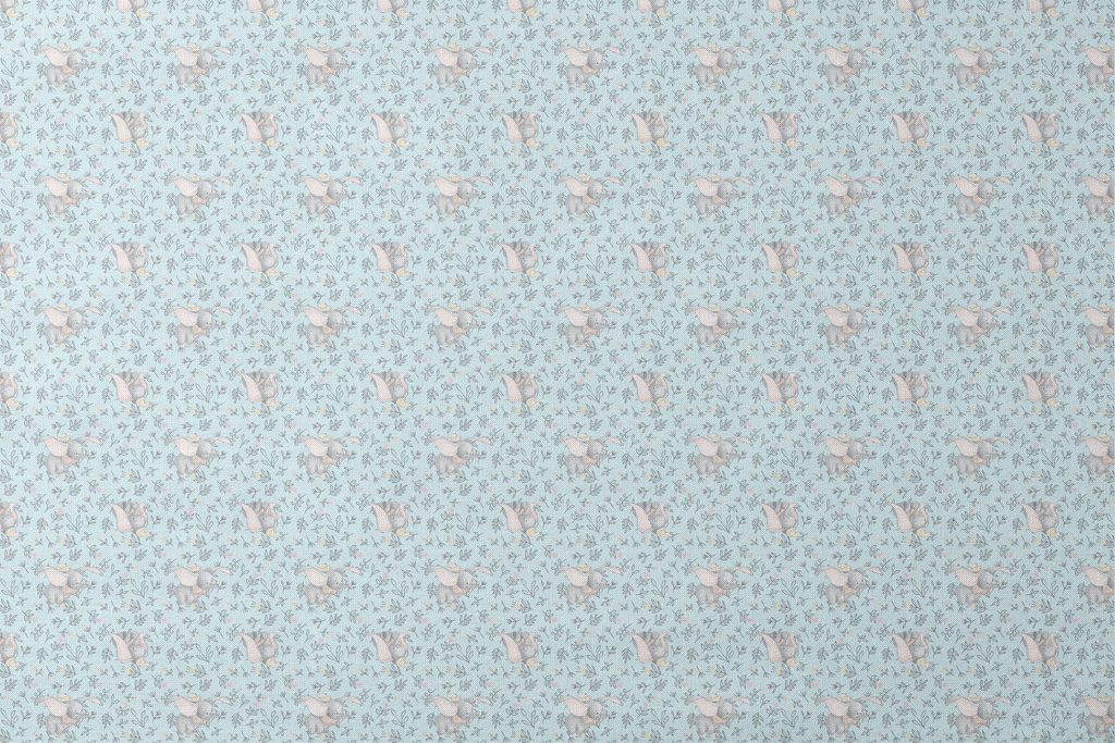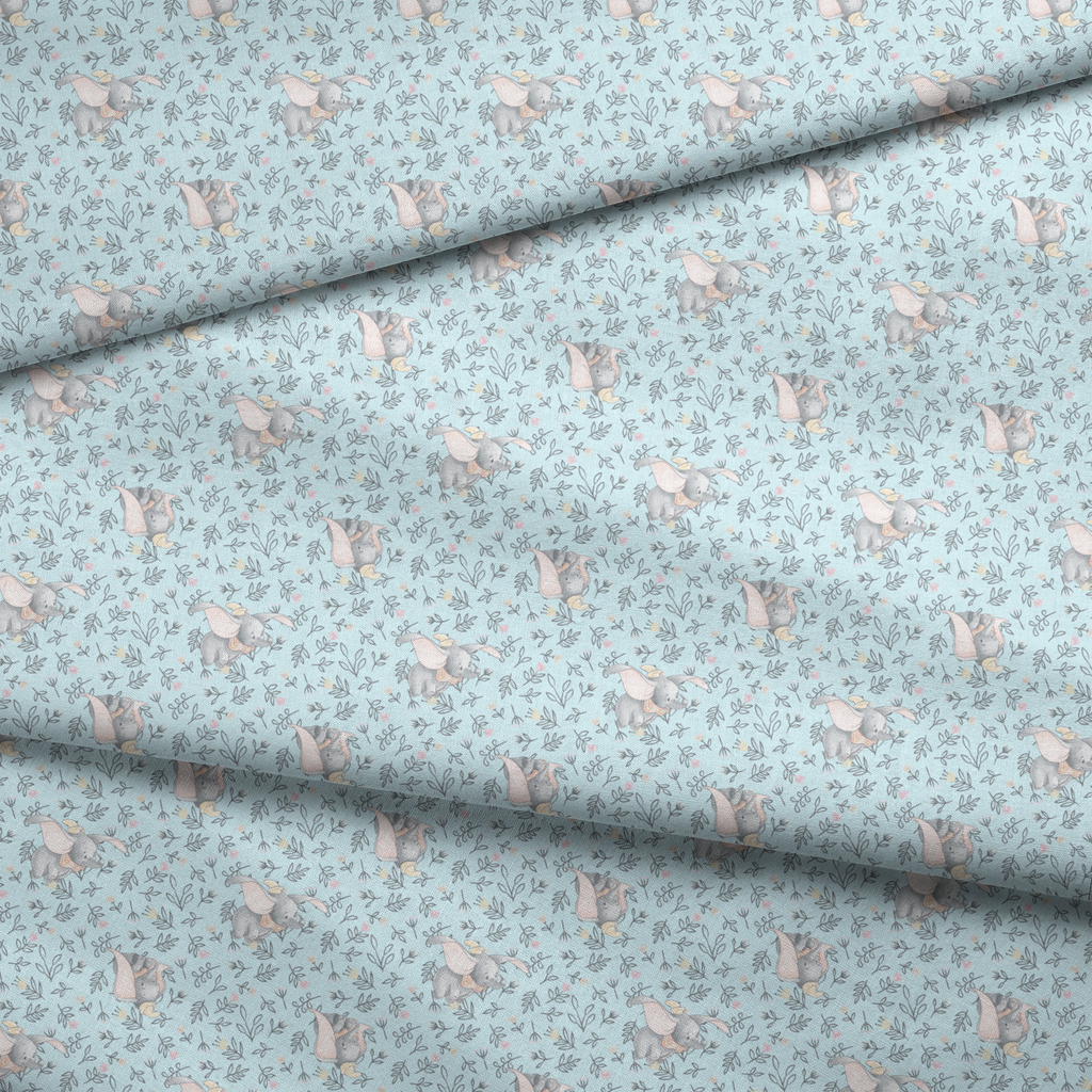 Adorable Dumbo among delicate botanical elements on a light blue background. Sweet nursery pattern perfect for baby apparel and bedding with its whimsical, calming aesthetic.