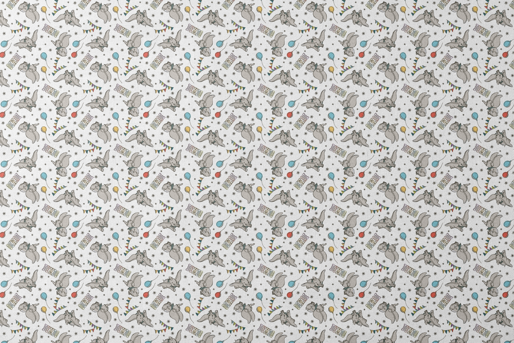 This delightful Dumbo pattern features the classic Disney elephant character flying with his oversized ears, surrounded by colorful balloons, festive balloons, and twinkling stars on a light background.