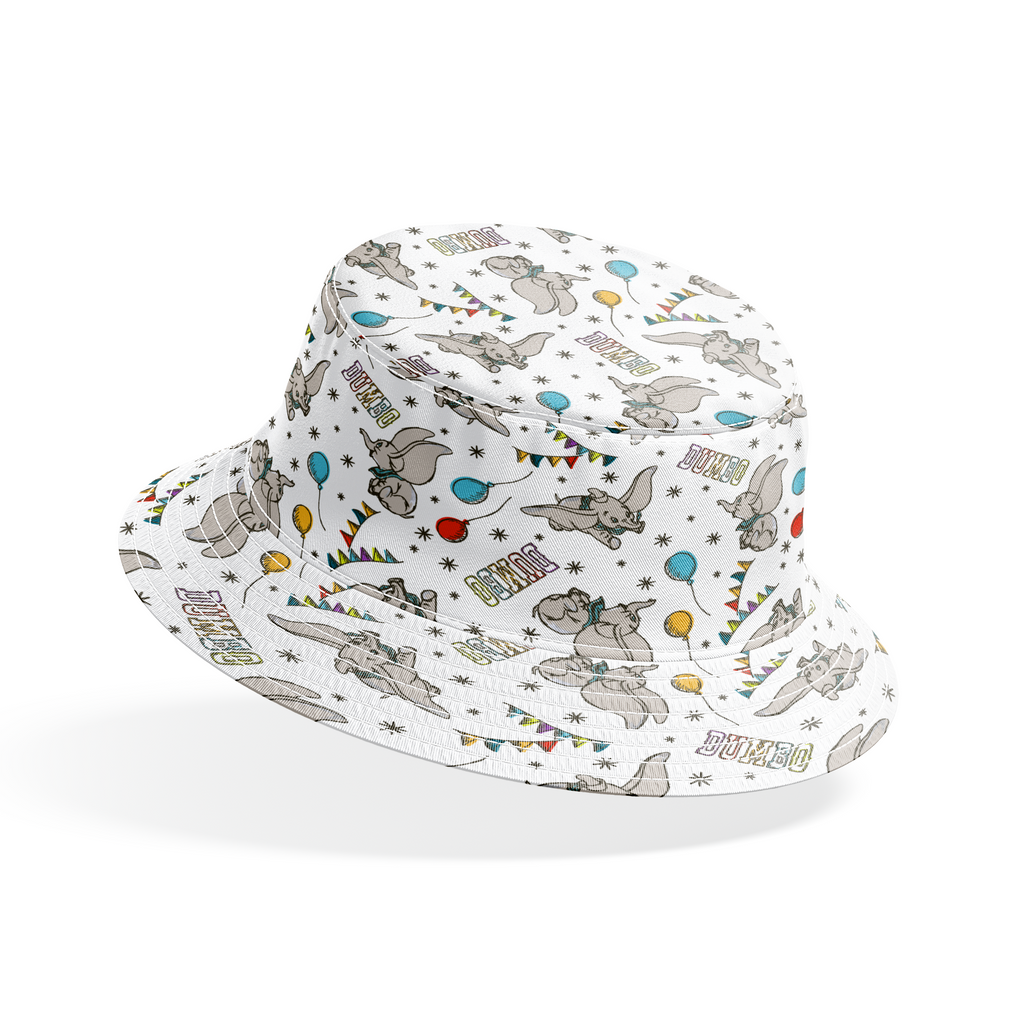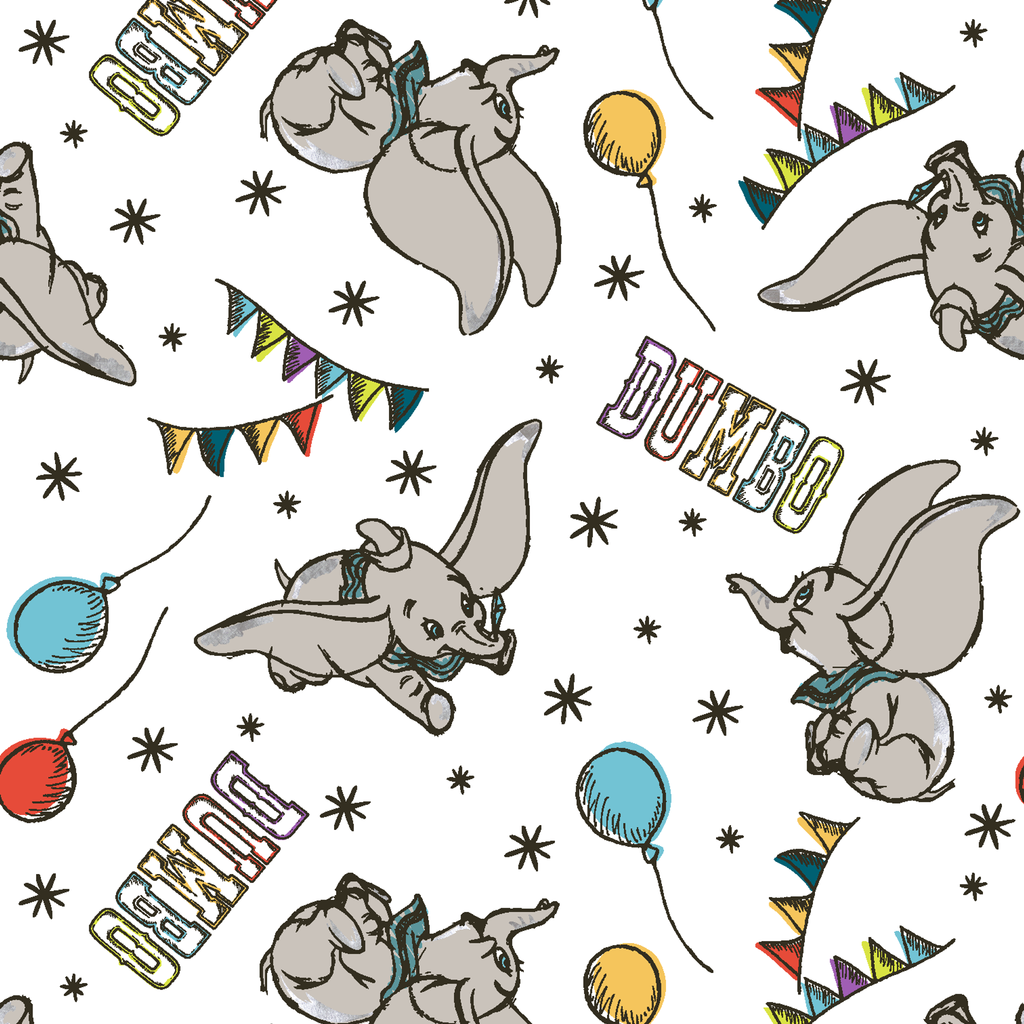 This delightful Dumbo pattern features the classic Disney elephant character flying with his oversized ears, surrounded by colorful balloons, festive balloons, and twinkling stars on a light background.