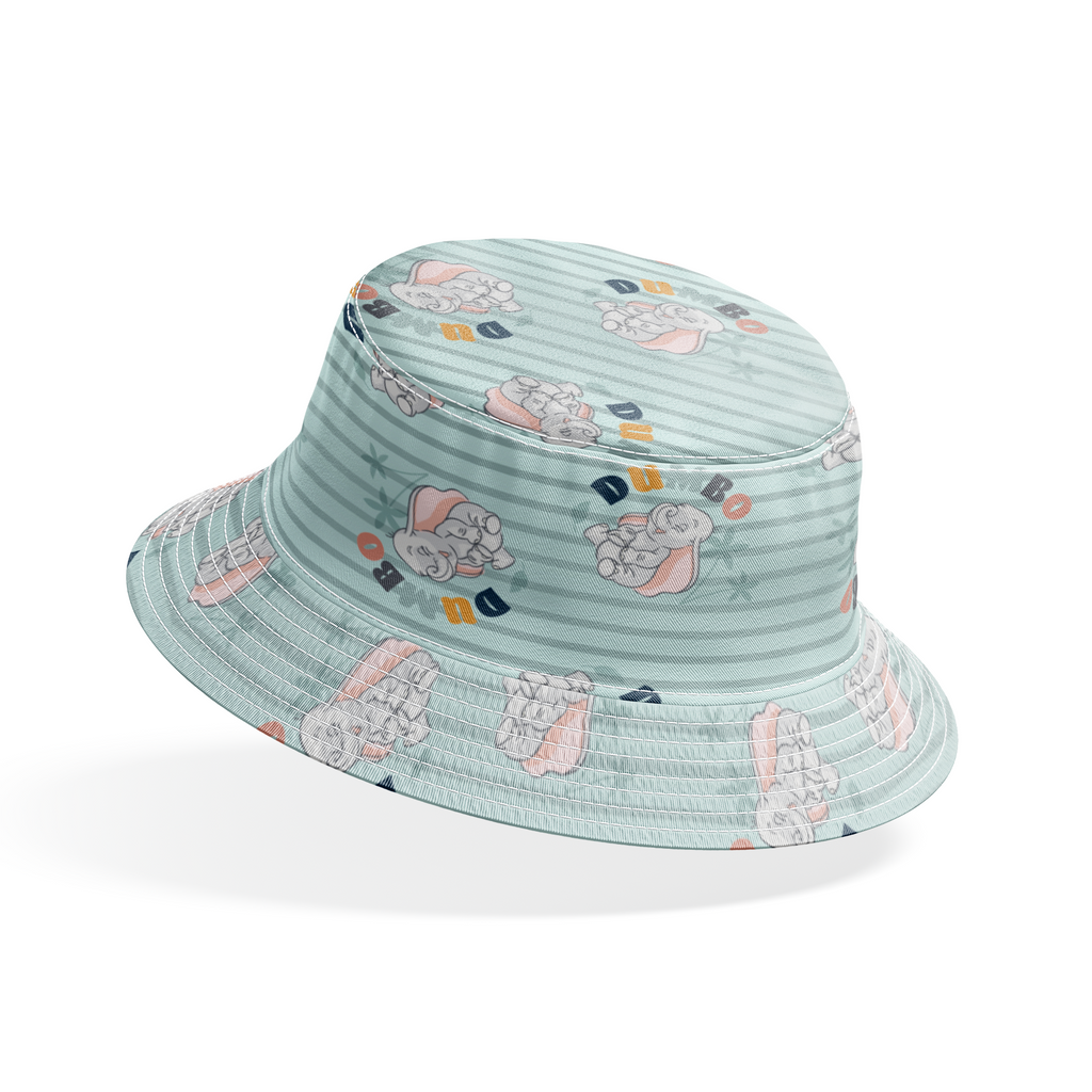 Adorable Dumbo pattern featuring the sweet cartoon elephant on a mint striped background with his name in colorful letters and delicate floral accents.