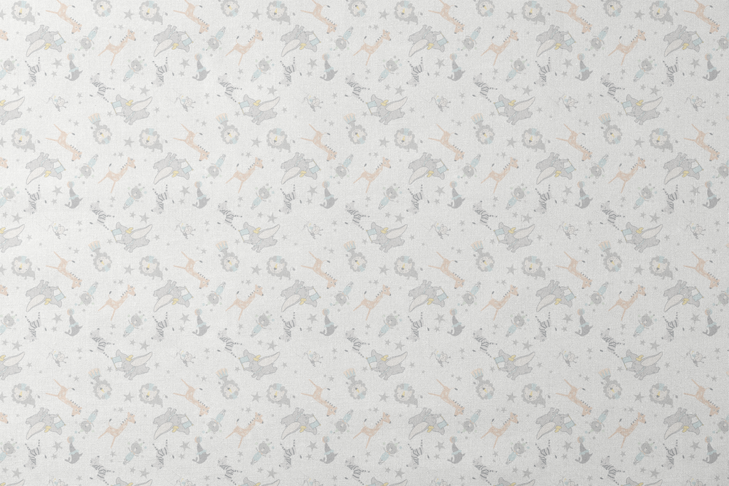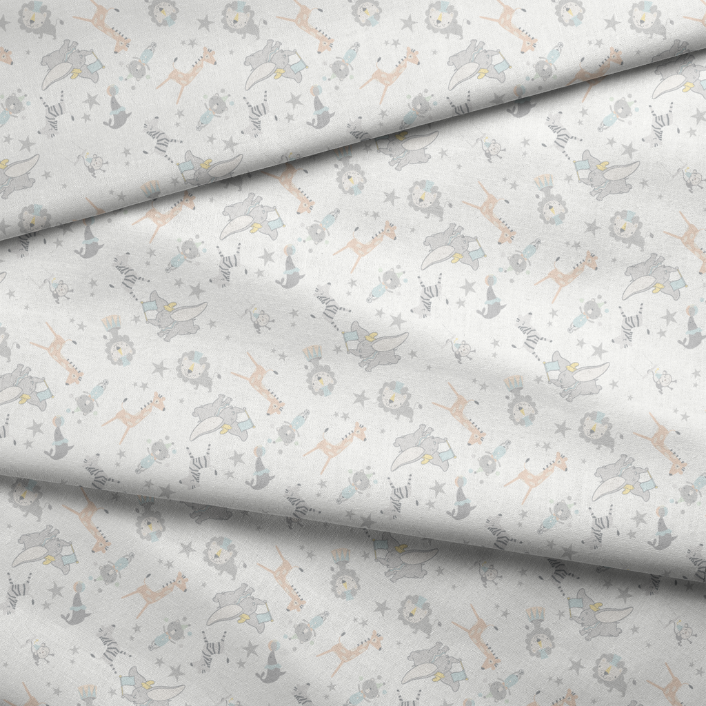 Adorable nursery pattern featuring Dumbo and playful safari animals including elephants, lions, giraffes, and zebras in soft pastel colors with stars on a white background.