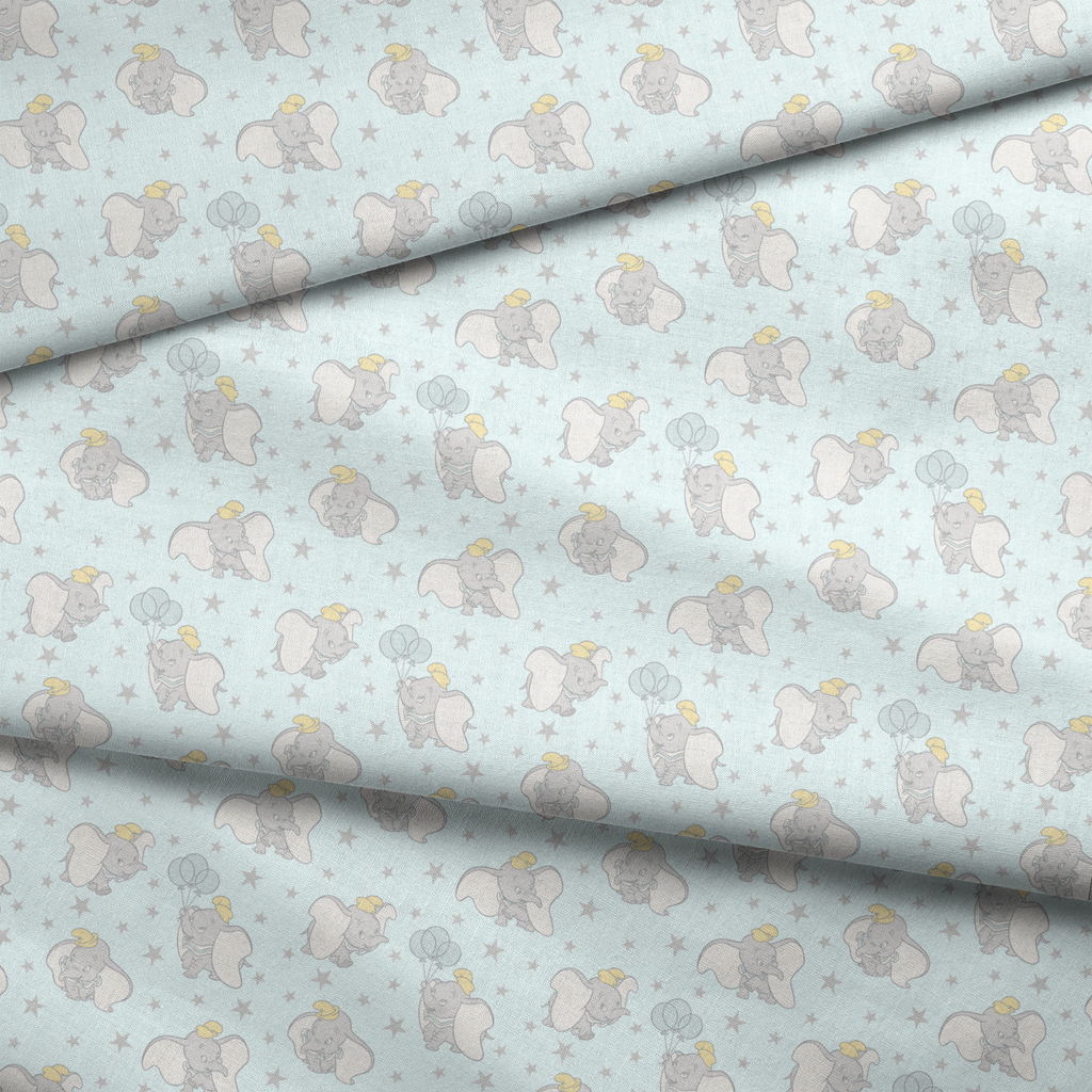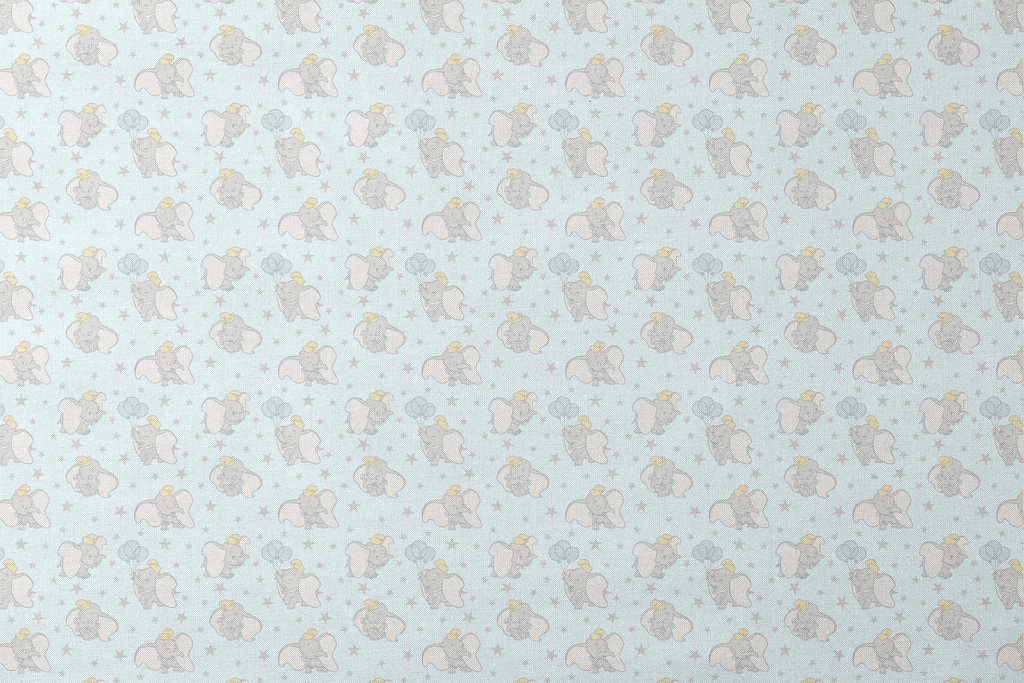 Adorable Dumbo the elephant pattern featuring the classic Disney character with large ears and yellow hat against a light background with subtle gray stars.