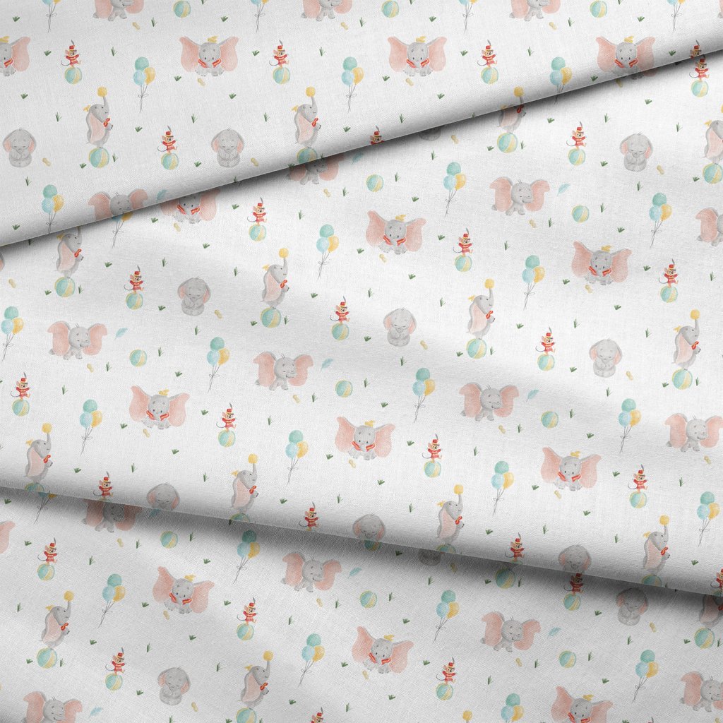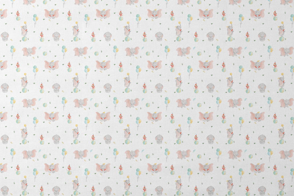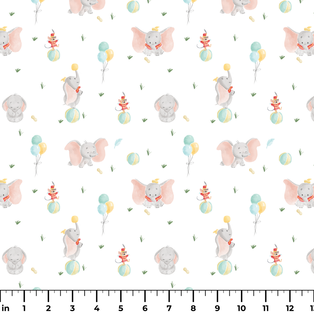 Whimsical circus-themed Dumbo pattern featuring adorable Dumbo balancing on colorful balls, with pastel balloons and playful details on a soft white background.