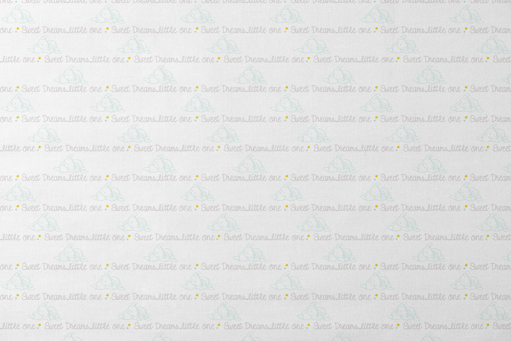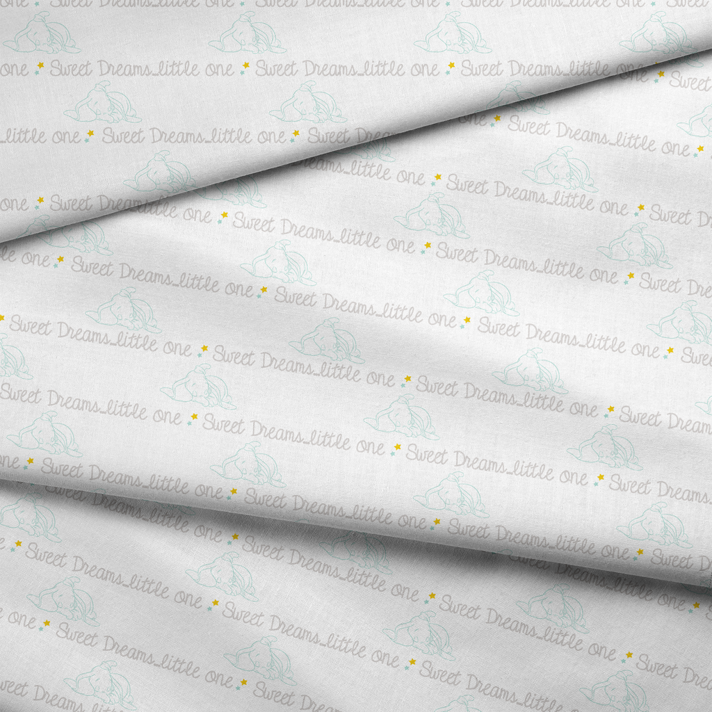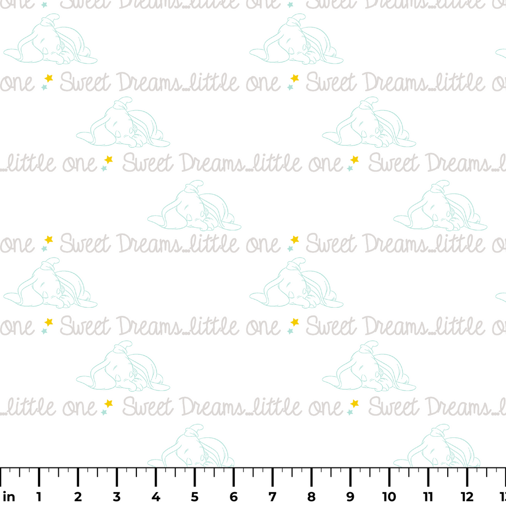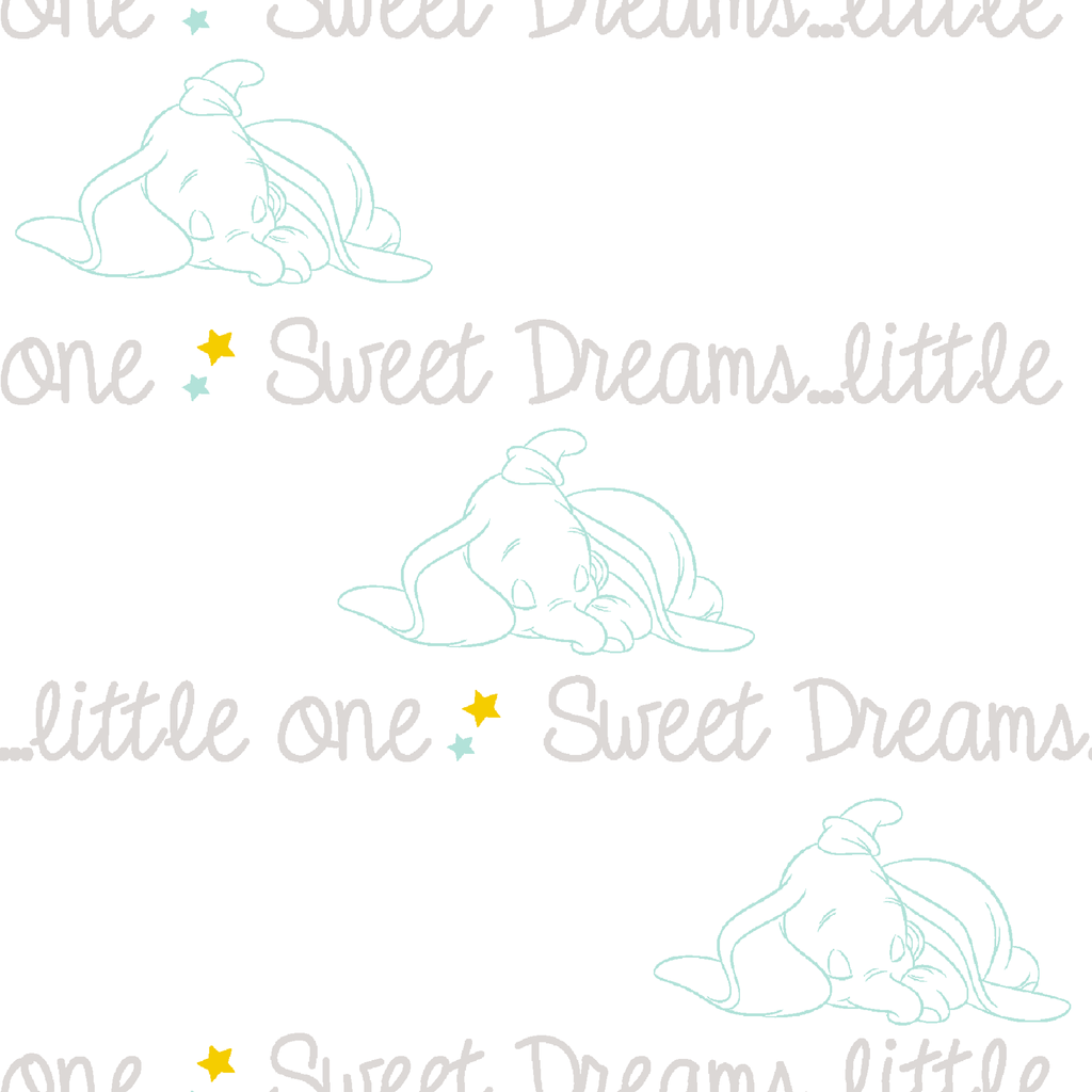 Adorable nursery pattern featuring a sleeping Disney Dumbo with "Sweet Dreams little one" text in soft, muted tones. Perfect for nursery decor.