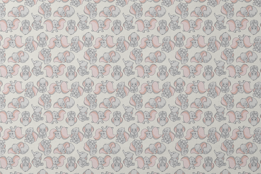 Adorable cartoon Dumbo pattern featuring sweet playful poses. Light grey and blush pink colorway perfect for nursery decor, children's apparel, or baby shower gifts.