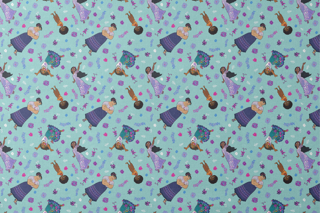 This whimsical Disney pattern showcases Encanto characters in traditional clothing amid colorful florals, butterflies and foliage, creating a vibrant cultural design perfect for home decor or apparel.