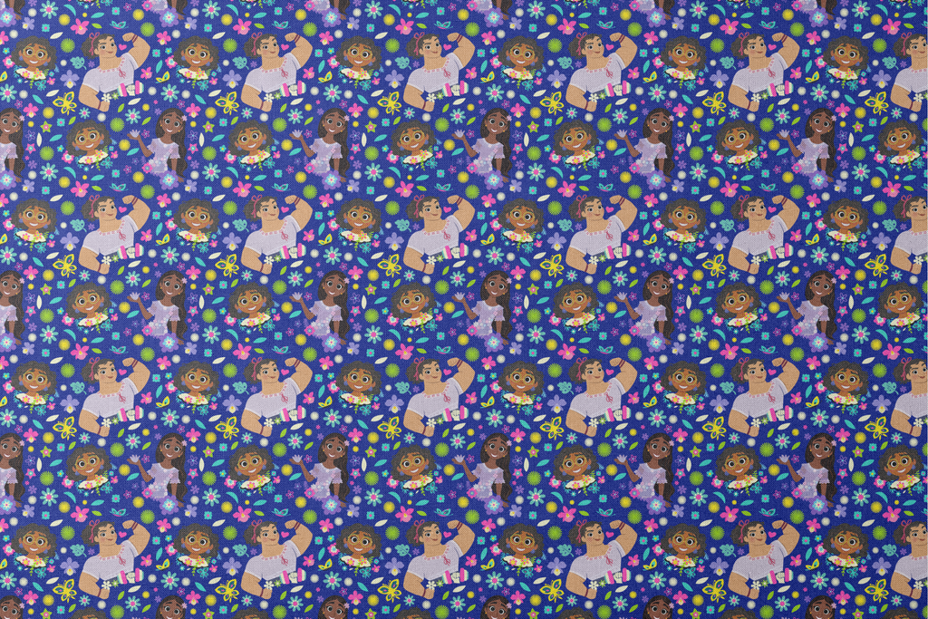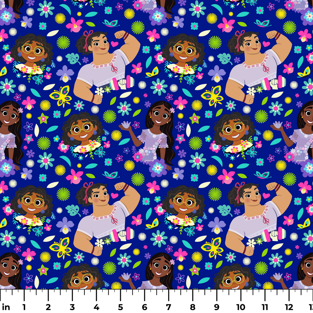 Vibrant Disney-inspired floral pattern featuring Encanto characters on a deep blue background, blending colorful blossoms and butterflies for a magical tropical feel.